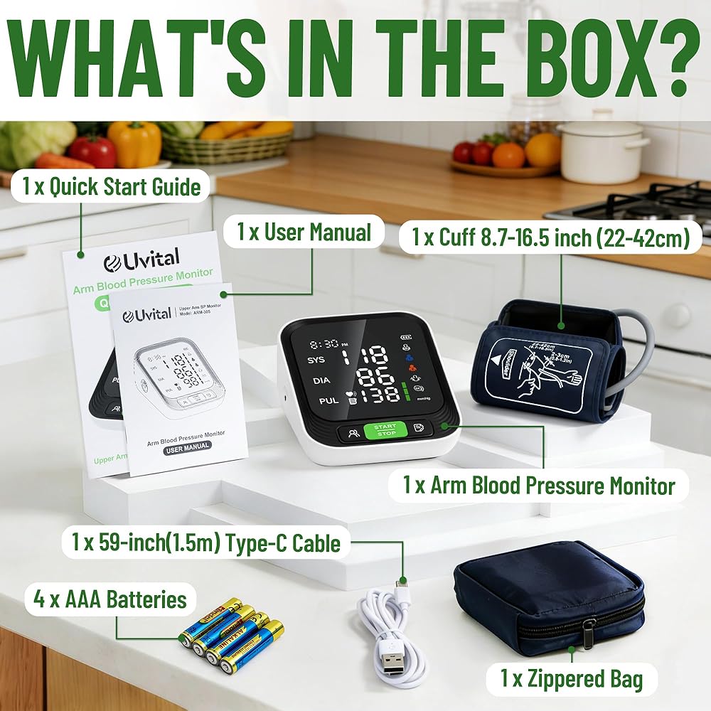 محتويات العلبة: 1 × جهاز قياس ضغط الدم في الذراع، 1 × سوار قابل للتعديل (8.7-16.5 بوصة)، 1 × حقيبة بسحاب، 1 × دليل المستخدم، 1 × دليل البدء السريع، 1 × كابل من النوع C مقاس 59 بوصة، 4 × بطاريات AAA. يرجى قراءة دليل التعليمات بعناية قبل الاستخدام للحصول على قياسات أكثر دقة