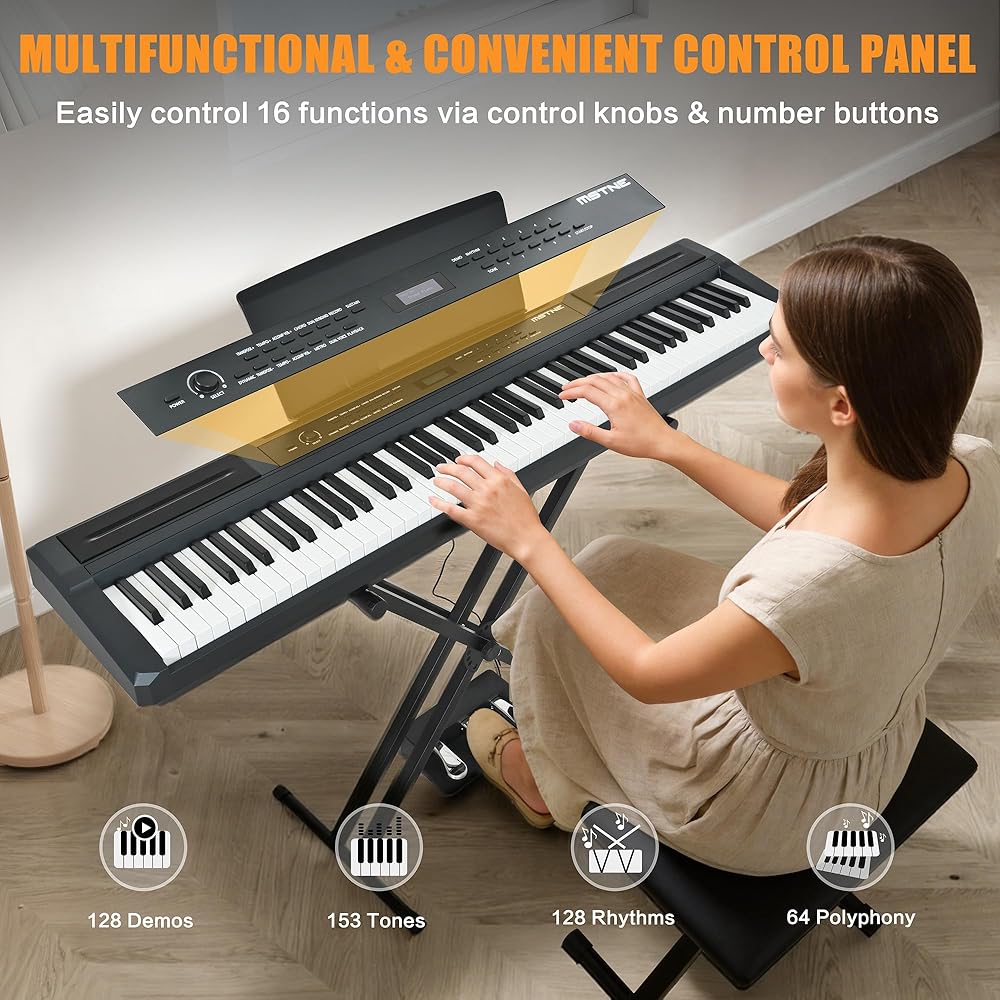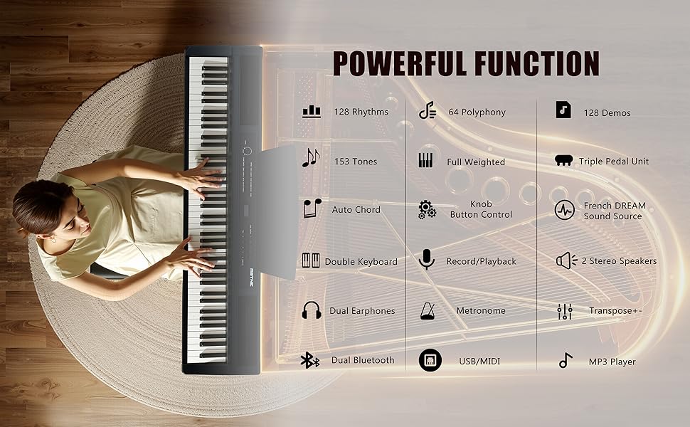 【تحكم متعدد الوظائف ومريح】: تتميز لوحة المفاتيح الموزونة المكونة من 88 مفتاحًا بلوحة أصلية متعددة الوظائف مع تحكم مريح في 16 وظيفة. يمكنك بسهولة تحديد مستوى الصوت والأغاني التجريبية والإيقاعات والنغمات عبر مقبض التحكم وأزرار الأرقام. استخدم الأزرار للتحكم في وظائف مثل النقل والإيقاع ومستوى الصوت المرافق والأوتار التلقائية ولوحة المفاتيح المزدوجة والنغمة المزدوجة والتسجيل والمزيد. اجعل من السهل تشكيل أسلوبك الموسيقي المميز.