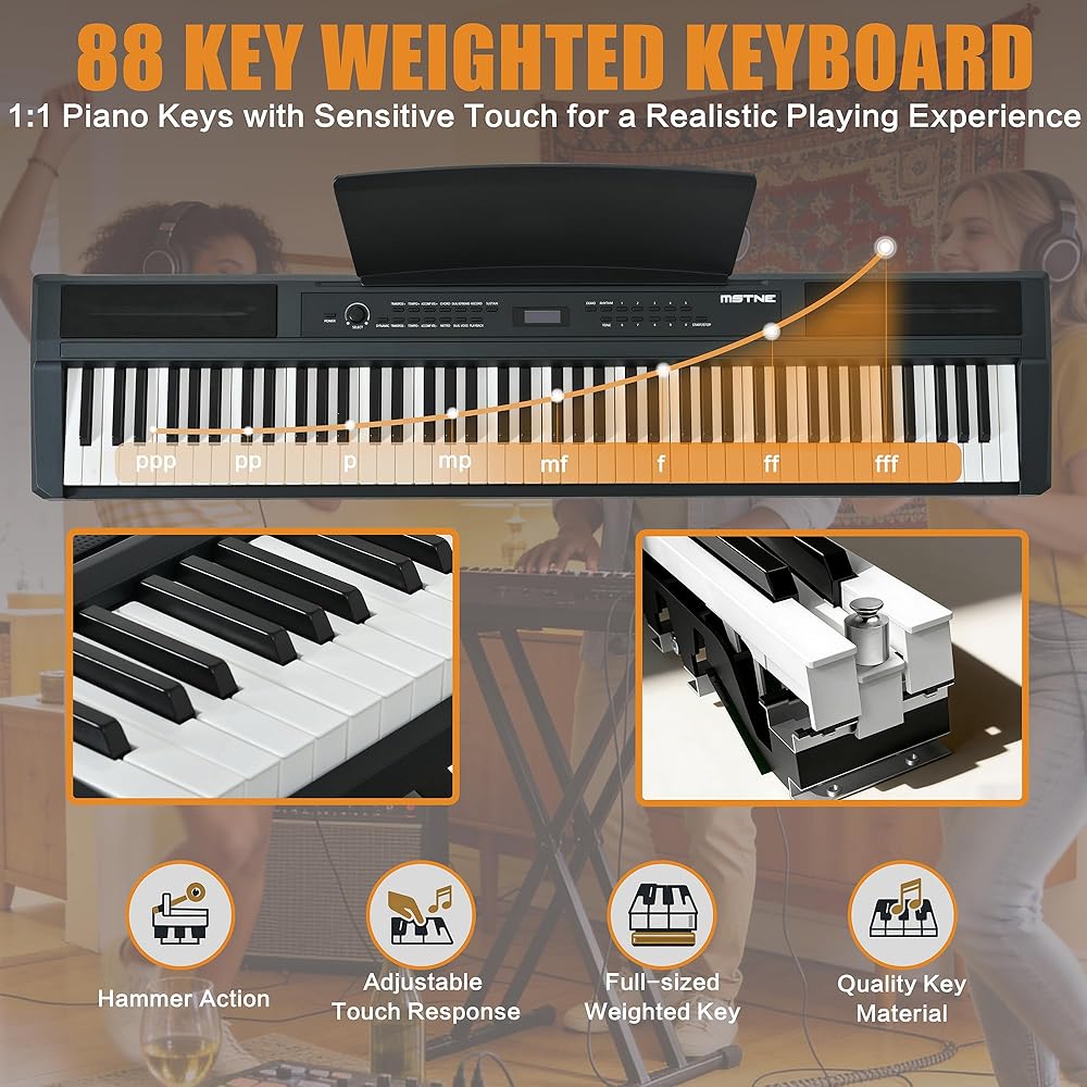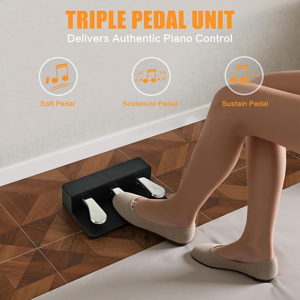 【عمل مطرقة لوحة المفاتيح المرجحة بـ 88 مفتاحًا احترافيًا】: تتميز لوحة مفاتيح البيانو الموزونة بالحجم الكامل هذه بـ 88 مطرقة تقدمية وتوفر لمسة حساسة. إنه يحاكي عمل المطرقة للبيانو الصوتي، مما يوفر إحساسًا أكثر واقعية وارتدادًا أقوى. تتميز الميزات بثلاث دواسات للتحكم في الاستدامة والناعمة والعظمية، مما يوفر تجربة موسيقية غامرة للمبتدئين والمتحمسين.
