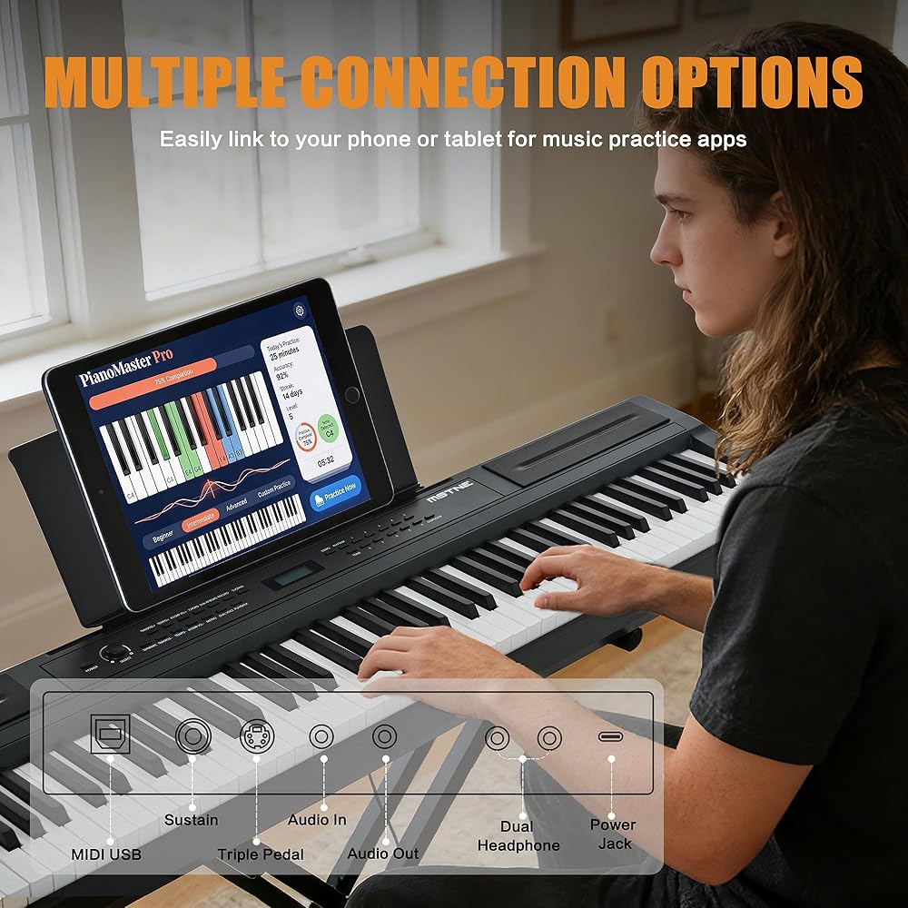 【اتصال ذكي】: يمكن لبيانو لوحة المفاتيح الكهربائية هذا الاتصال بسهولة بأجهزة مثل الهواتف المحمولة وأجهزة الكمبيوتر اللوحية عبر MIDI-USB وBluetooth، وهو متوافق مع تطبيقات ممارسة الموسيقى مثل POP Piano وPerfect Piano. يتيح لك تصميم مقبس سماعة الرأس المزدوج توصيل زوجين من سماعات الرأس في وقت واحد، مما يضمن عدم إزعاج الآخرين أثناء ممارسة الموسيقى أو الاستمتاع بها.