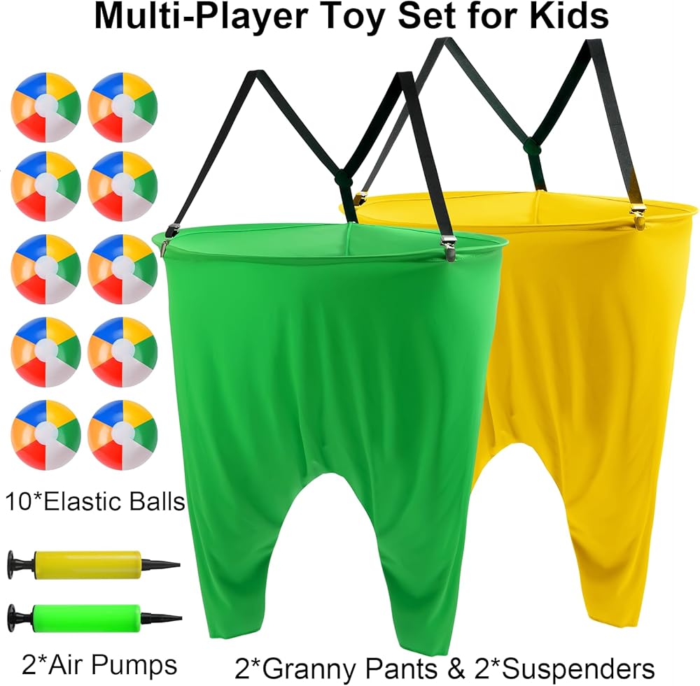 مجموعة Granny Pants Yard Game All-Inclusive لحفلات عيد الفصح: مجموعة ألعاب الهواء الطلق المضحكة للأطفال من سن 5 إلى 8 سنوات، تتضمن بنطالين كبيرين باللونين الأخضر والأصفر (طول 31.5 بوصة، عرض 21.7 بوصة)، 10 كرات نطاطة ملونة، 2 حمالات قابلة للفصل، 2 مضخة هواء، ودليل تعليمات. جميع الملحقات معبأة في صندوق هدايا كرتوني مصمم بشكل مرح. مثالية لألعاب الحفلات في الفناء الخلفي، أو ألعاب الكرنفال الداخلية والخارجية، أو ألعاب بناء الفريق أو المناسبات المدرسية
