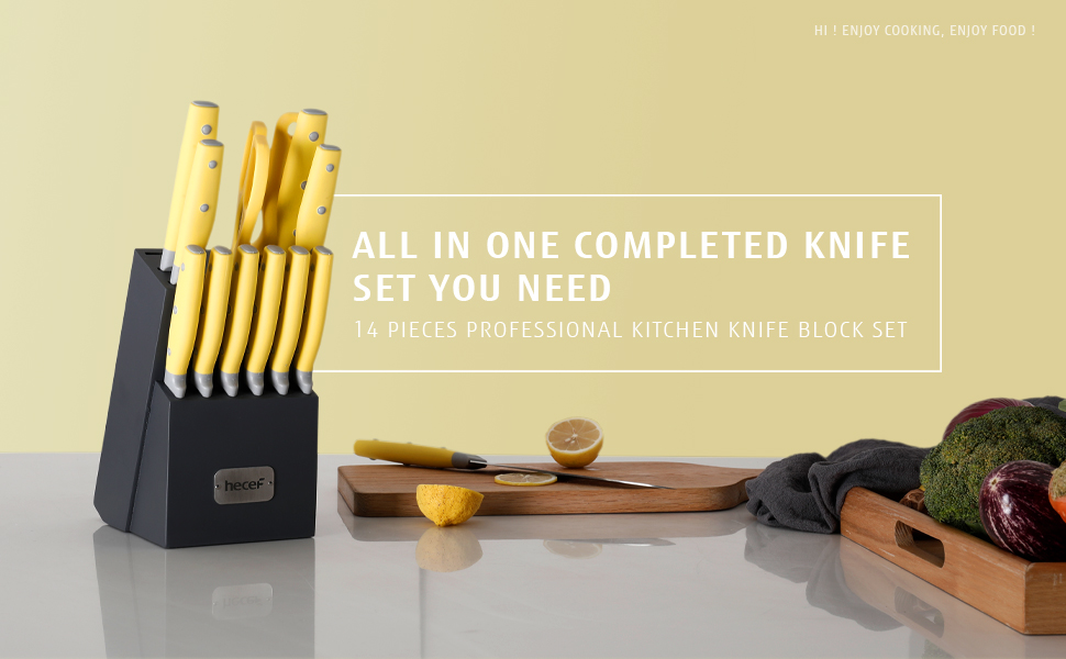 مجموعة سكاكين المطبخ من هيسيف، مجموعة سكاكين 14 قطعة مع كتلة خشبية ومبراة فولاذية ومقص متعدد الأغراض، مجموعة أدوات مائدة من الفولاذ المقاوم للصدأ عالي الكربون (أصفر)