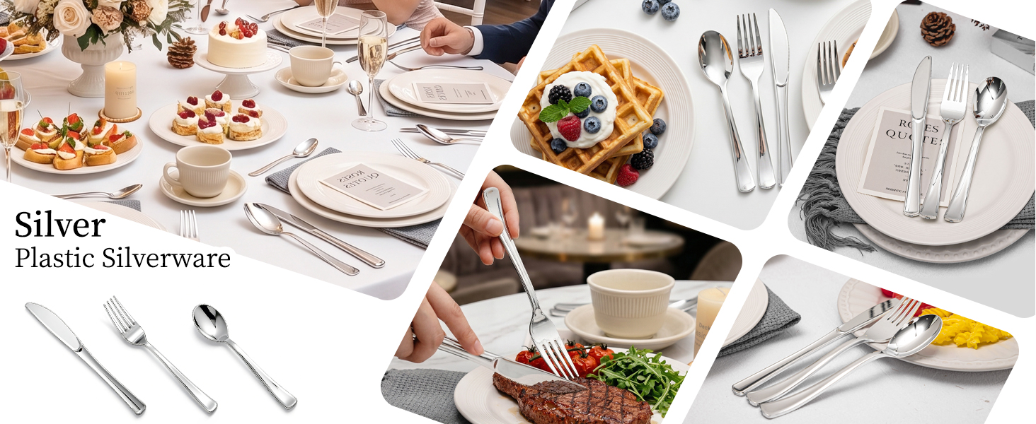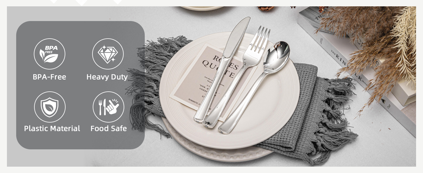 متينة وأنيقة: تتميز أدوات الفضة N9R التي تستخدم لمرة واحدة بسطح أملس، مما يوفر نفس اللمعان الذي توفره الأدوات الفضية الحقيقية. تتميز أدواتنا البلاستيكية بأنها شديدة التحمل ومتينة، لذلك يمكنك استخدامها دون القلق بشأن الكسر