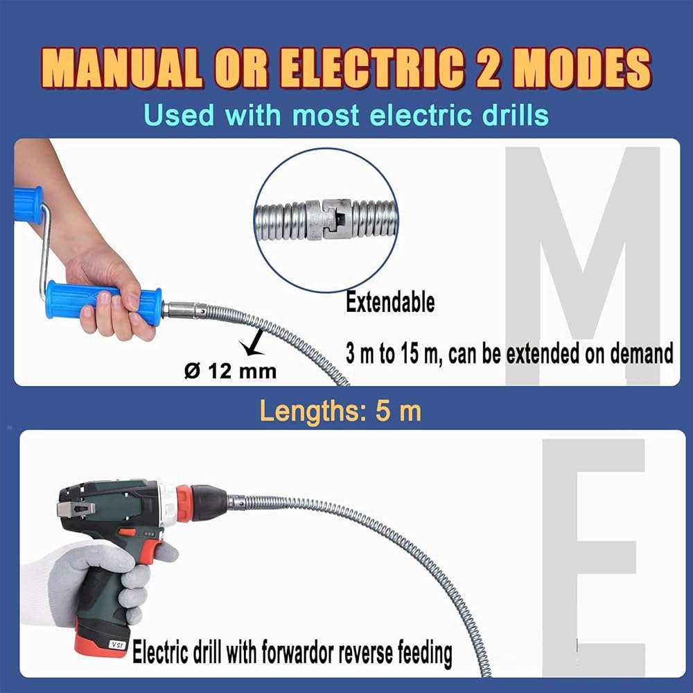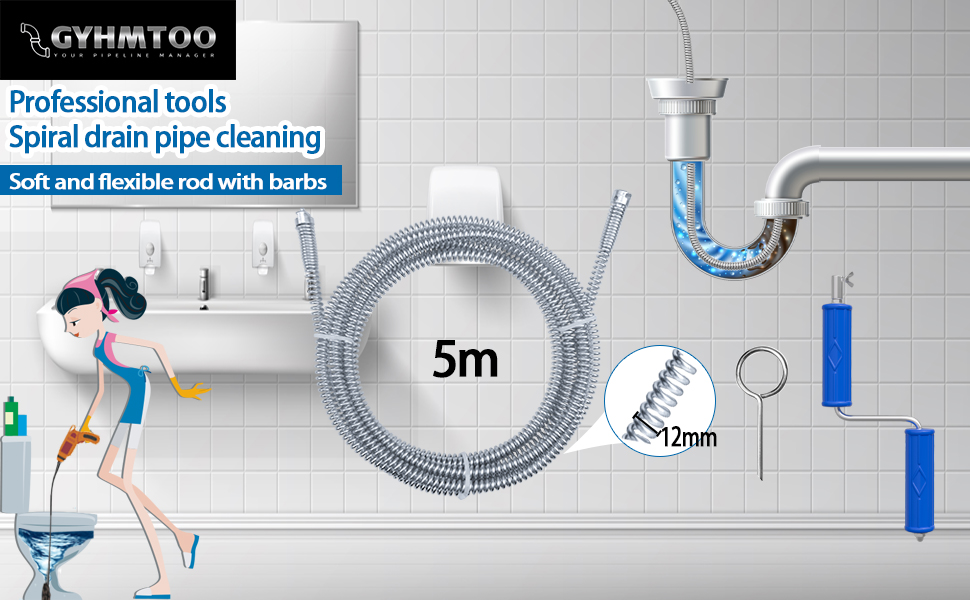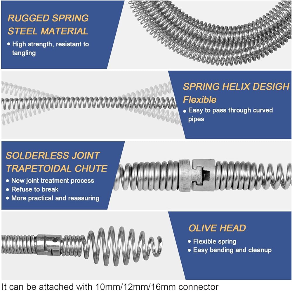 ثعبان تنظيف الأنابيب عالي الجودة: ثعبان من الفولاذ المجلفن، قوي ومتين، مساعد رائع في المنزل. القطر 12 ملم، والطول 16.4 بوصة/5 متر كافي لحل مشاكلك عند انسداد الحمام أو المطبخ بسبب التحميل الزائد على مواسير الصرف الصحي