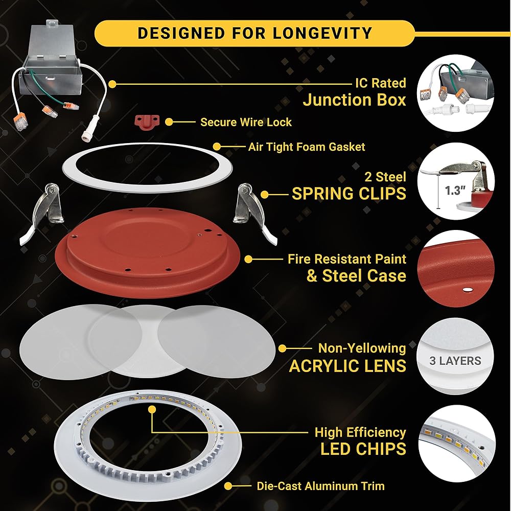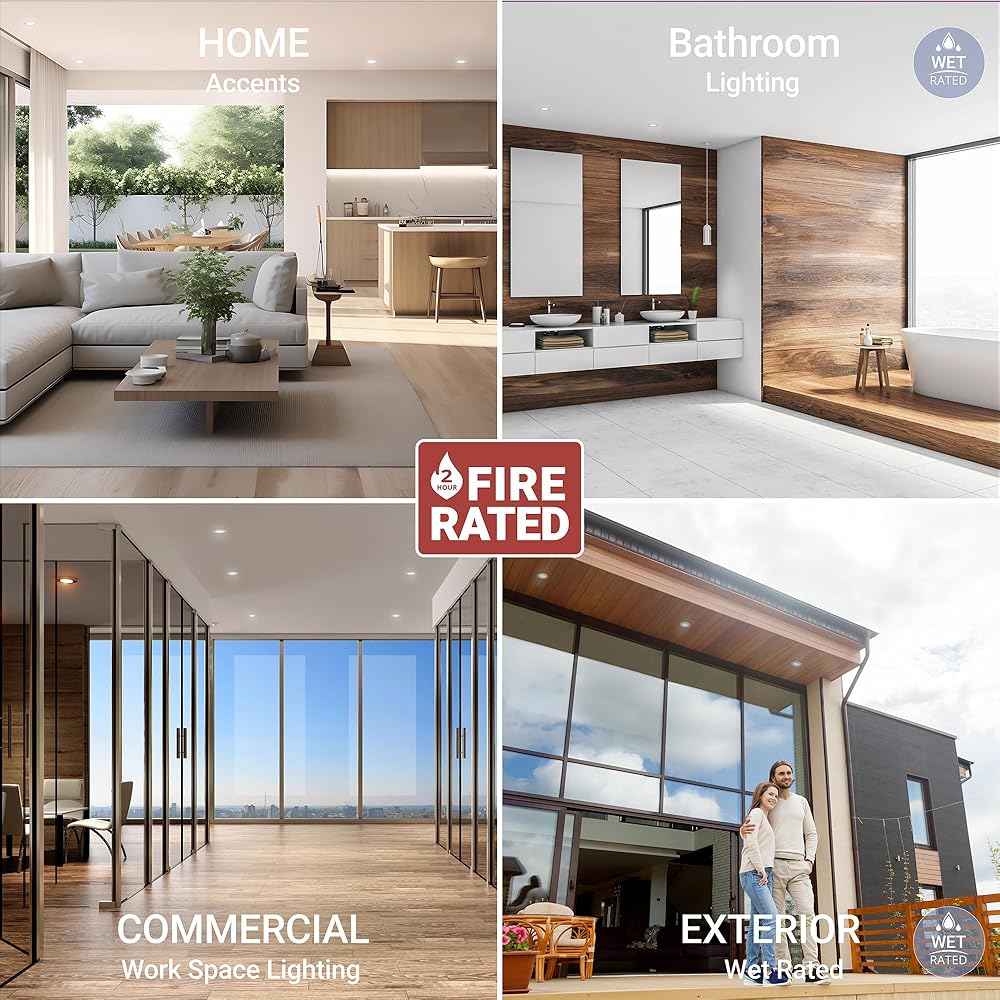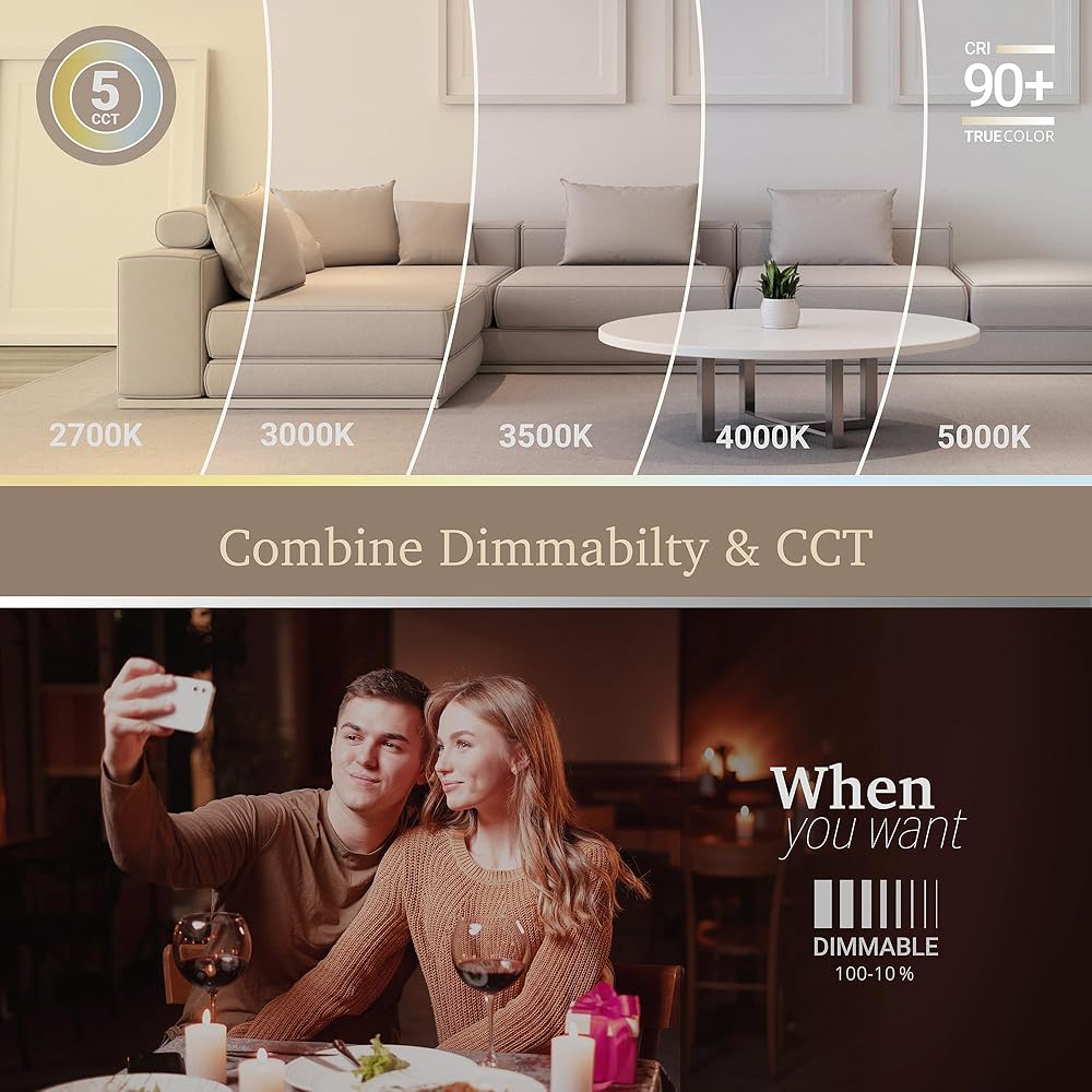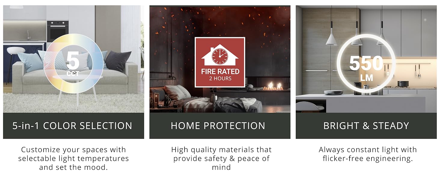 • 5 تركيبات إضاءة مقاومة للحريق CCT - تتميز مصابيح السقف LED المريحة هذه بـ 5 خيارات لدرجة حرارة اللون. استخدم المفتاح الموجود في صندوق توصيل الإضاءة بدون علبة للاختيار من بين 2700K White Soft، و3000K White Warm، و3500K White Neutral، و4000K White Cool، و5000K Daylight.