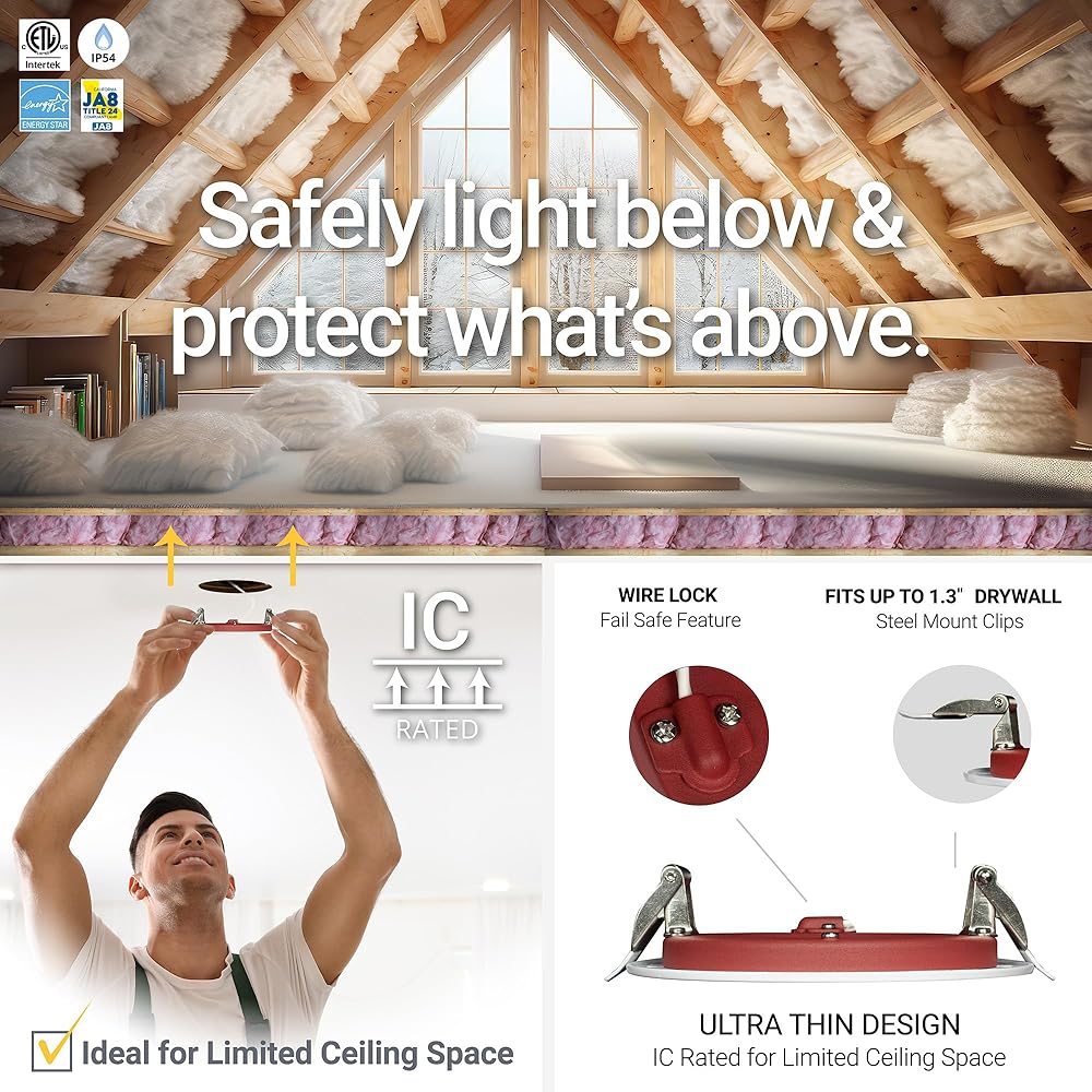 • مصابيح LED عالية القبعة مُحكمة بالهواء ومُصنَّفة من IC - تم تصنيع تركيبات الإضاءة LED المريحة مقاس 3 بوصة من الفولاذ المقاوم للحرارة والألومنيوم المتين في المشابك للتثبيت الآمن في الأسقف المعزولة. تستوعب هذه المصابيح المريحة مقاس 3 بوصة التي لا يمكن أن تحتوي على أسقف ما يصل إلى 1.5 بوصة من الحوائط الجافة المزدوجة في معظم التطبيقات السكنية أو التجارية.