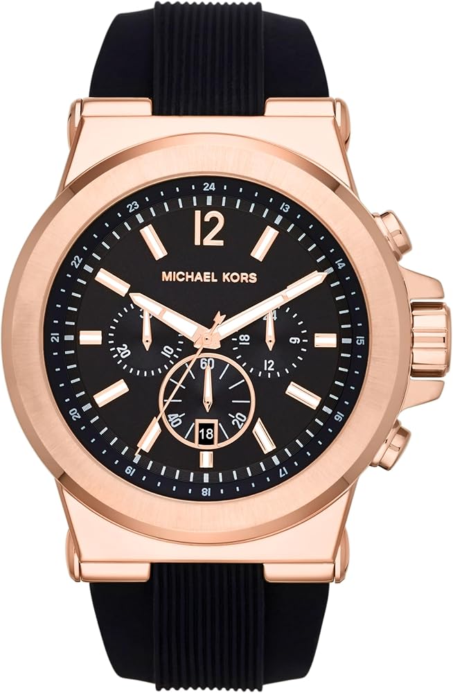 - تتميز ساعة ديلان 45 ملم من مايكل كورس بمينا أشعة الشمس نافي بتفاصيل وردية وهيكل ذهبي وردي وسوار سيليكون كحلي وحركة دائرية