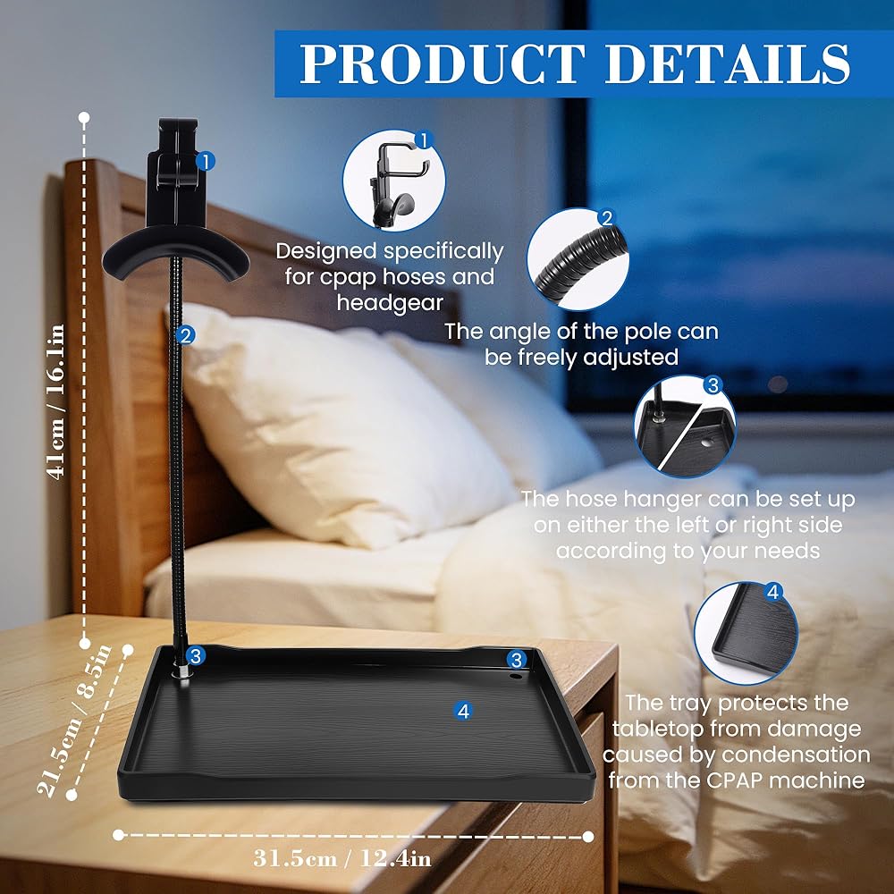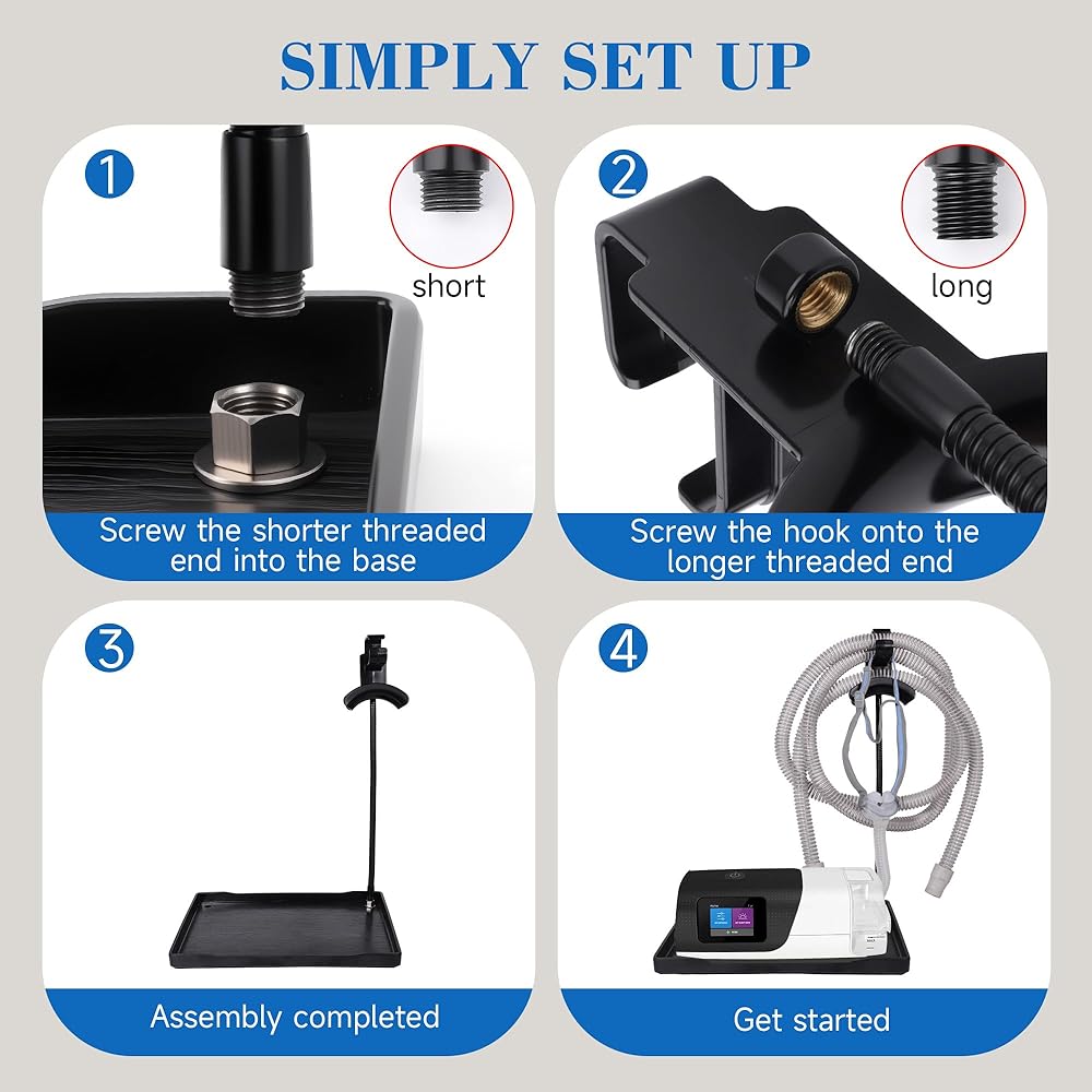 ملحق CPAP العالمي مع حامل قابل للتعديل: يوفر حامل CPAP العالمي هذا توافقًا ممتازًا. يسمح لك القضيب القابل للتعديل بتعديل الزاوية لتناسب وضع نومك. يعمل بشكل مثالي كحامل عصابة رأس CPAP، أو حامل أنابيب CPAP، أو حتى حامل CPAP بجانب السرير. توفر الخطافات الجانبية المتضمنة مساحة تخزين إضافية لقناعك، مما يجعلها أداة مثالية لإدارة أنابيب CPAP لأي مستخدم.