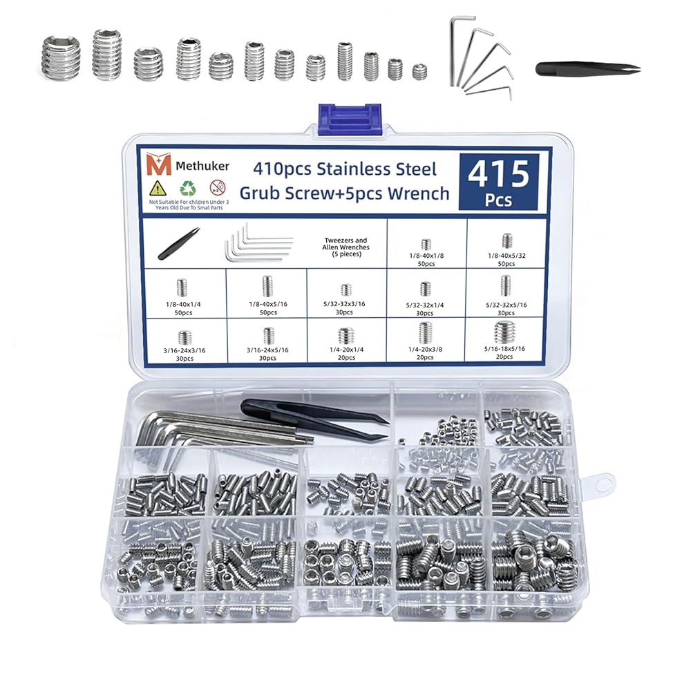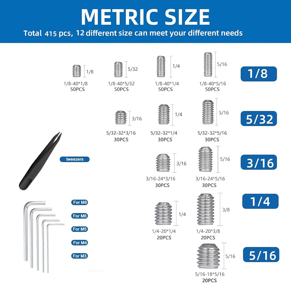 [Complete Tools] Total 415 pcs,This kit includes set screws in 12 most-used sizes (1/8"-40 to 5/16"-18), along with 5 hex wrenches and a tweezer