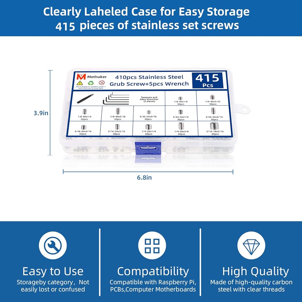 This 415-piece Imperial Hexagon Allen head set screw assortment kit is crafted from high-quality 304 stainless steel, offering superior corrosion resistance and durability for demanding fastening applications. The set includes 12 most-used sizes (1/8"-40 to 5/16"-18) to accommodate a wide range of projects, from precision electronics to bathroom fixtures and furniture. Each screw features clean-cut threads and smooth edges for secure, reliable holding power and easy installation with the included set of 5 metric hex keys. Ideal for both professionals and DIY enthusiasts, these grub screws are perfect for securing door handles, faucets, light fixtures, piping, machinery, appliances, and hobbyist models. The screws come neatly organized in a sturdy, compartmentalized storage case with a labeled size chart for quick identification and convenience. Whether for workshop use or on-the-go repairs, this kit provides a versatile and practical fastening solution that combines quality, variety, and user-friendly packaging