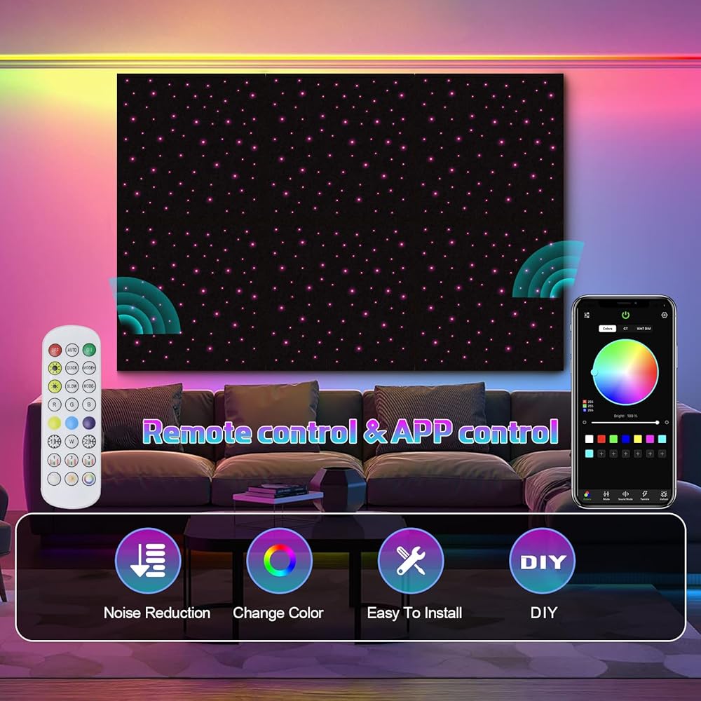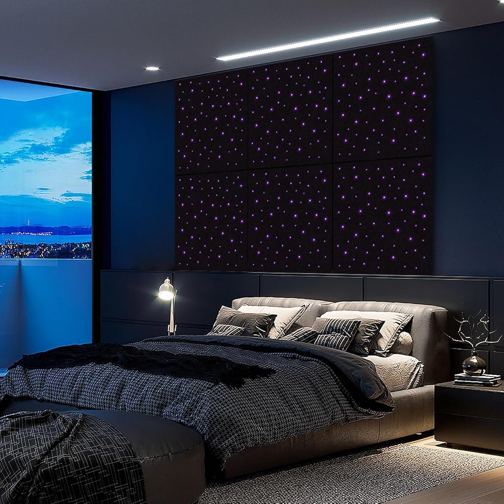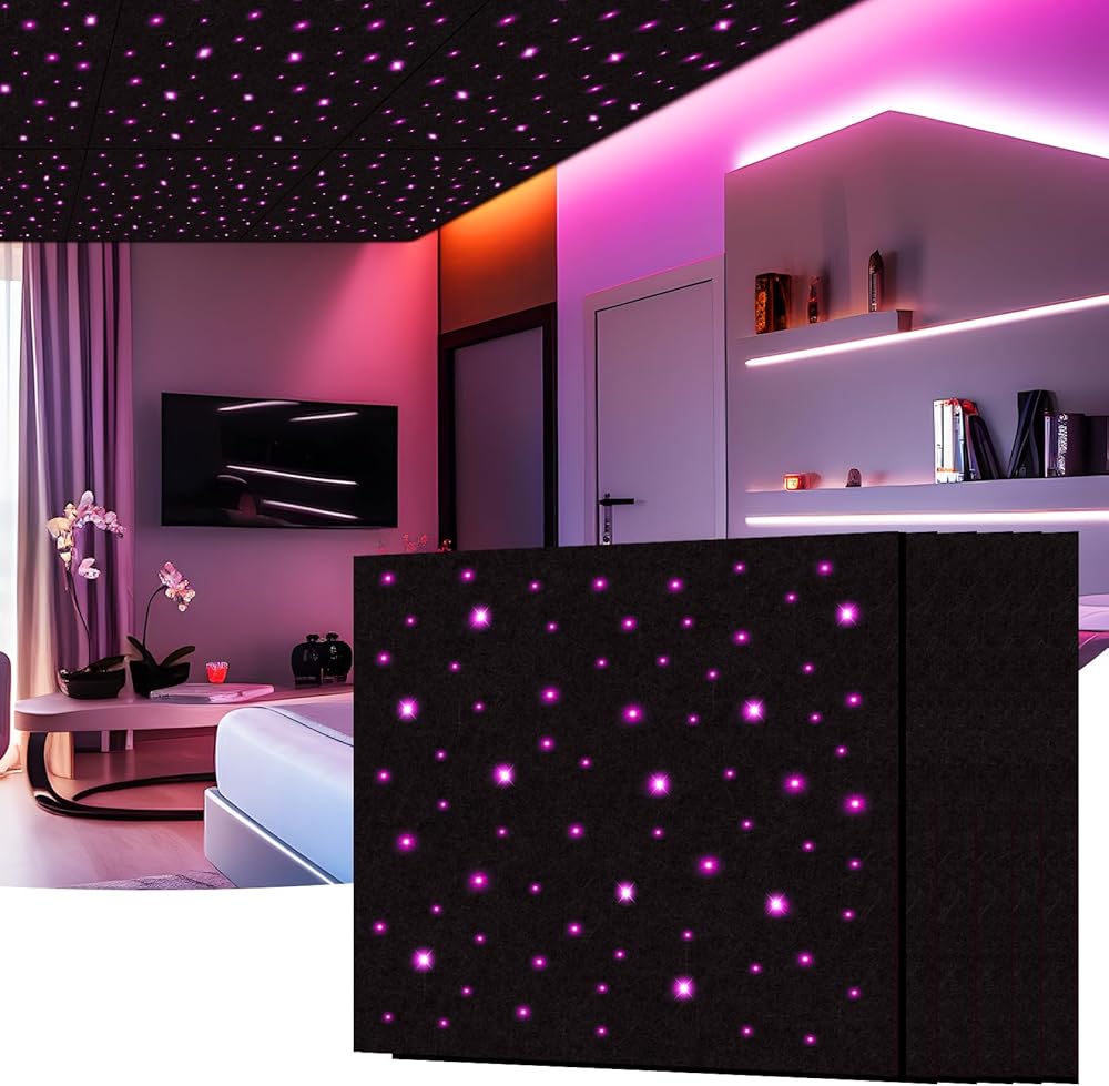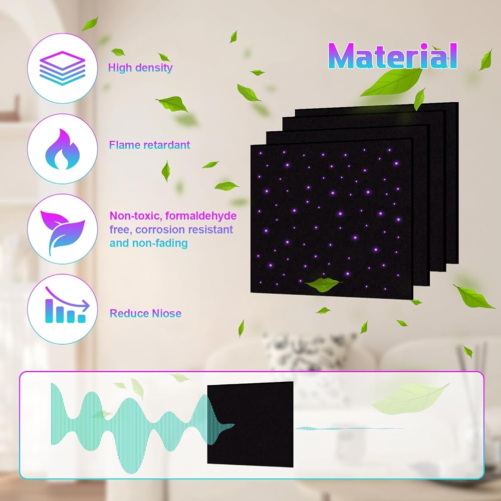 【سحر مزدوج: تألق صوتي + جمالي】لوحة فقط تجمع بين عازل الصوت وتأثيرات ضوء النجوم الساحرة! تخلق الألياف الضوئية عالية الكفاءة توهجًا يشبه المجرة. قم بتحويل الجدران/الأسقف اللطيفة إلى تحفة بصرية مع حجب الضوضاء.