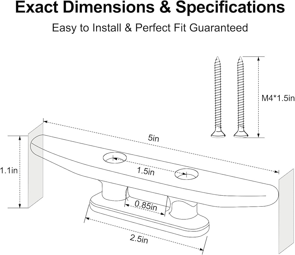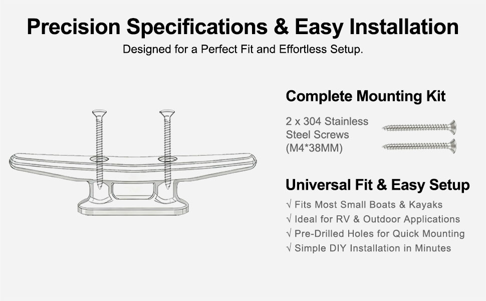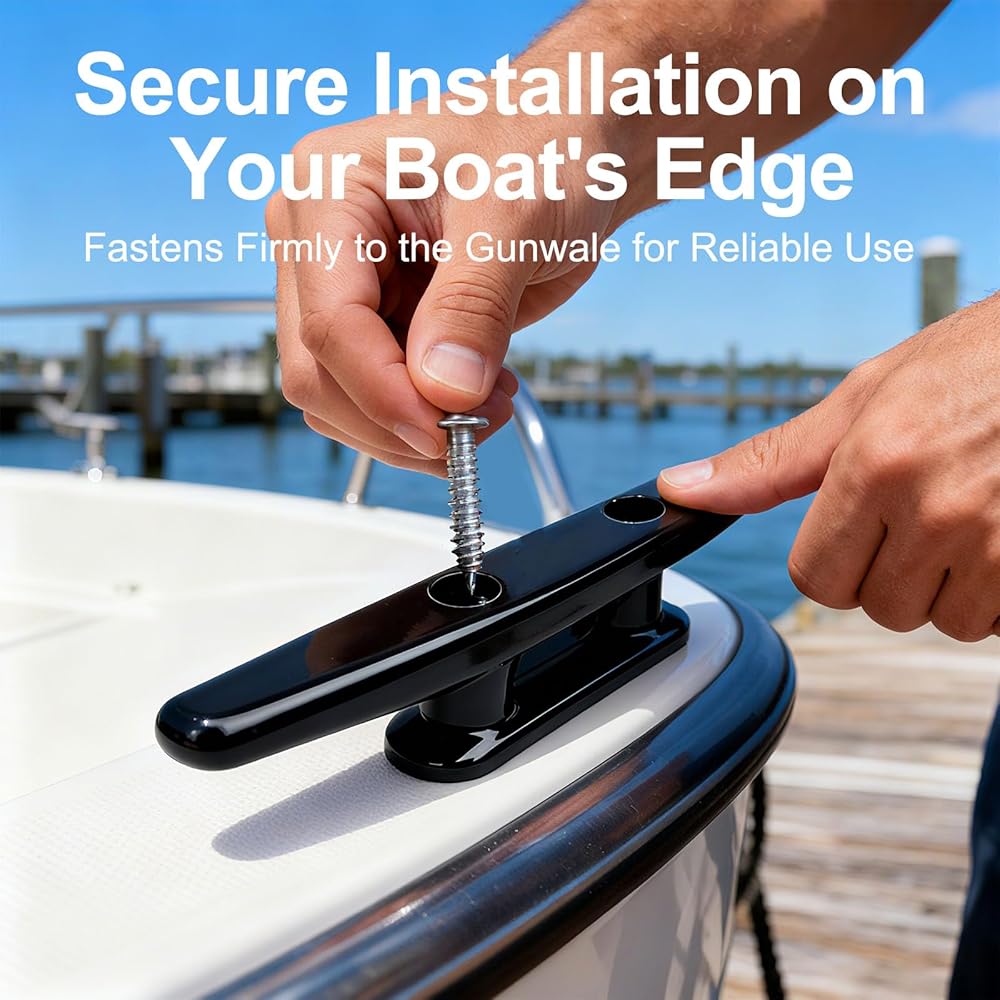 ملاحظة التثبيت: حدد موقع التثبيت بقوة هيكلية كافية داخل السطح أو هيكل الهيكل - وتجنب المقاطع الرقيقة أو المجوفة. تأكد من استخدام غسالات مانعة للارتخاء ومانع تسرب مناسب (مثل مانع التسرب السيليكوني) لمنع دخول الماء وفك المسمار. موصى به: 4 قطع من قاعدة القارب السوداء المصنوعة من النايلون الأسود (القوس، المؤخرة، والوسطى على كل جانب لخيارات ربط متعددة الاستخدامات)