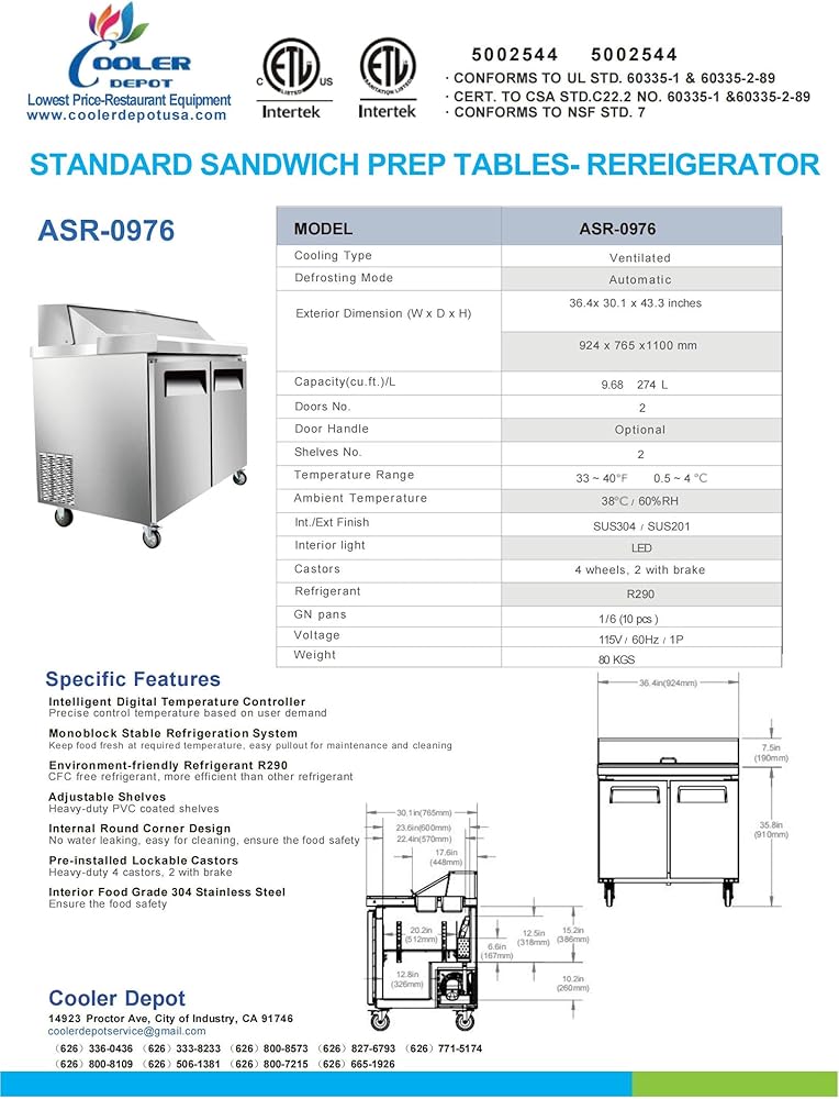 • This Sandwich Preparation Table has an overall dimension of 36 inches Wide X 29 inches Depth X 42 inches Height. The construction of this unit is designed with commercial use in mind. It features a 430 type stainless steel exterior and 304 type stainless steel interior, which are fortified with foamed-in-place polyurethane insulation. The insulation also helps to promote proper temperature retention. For operation, the prep table requires a 115V electrical connection.
