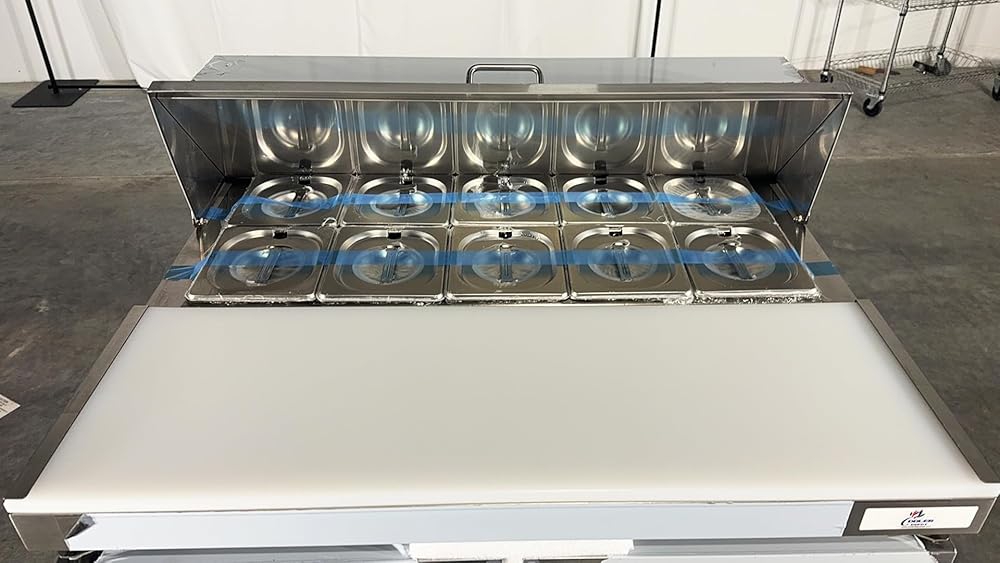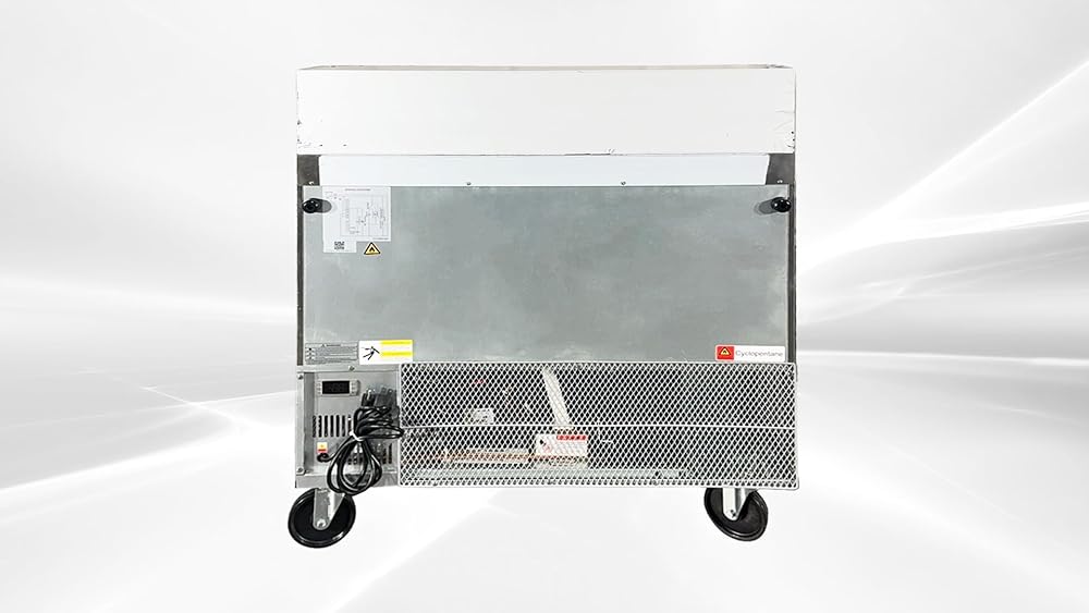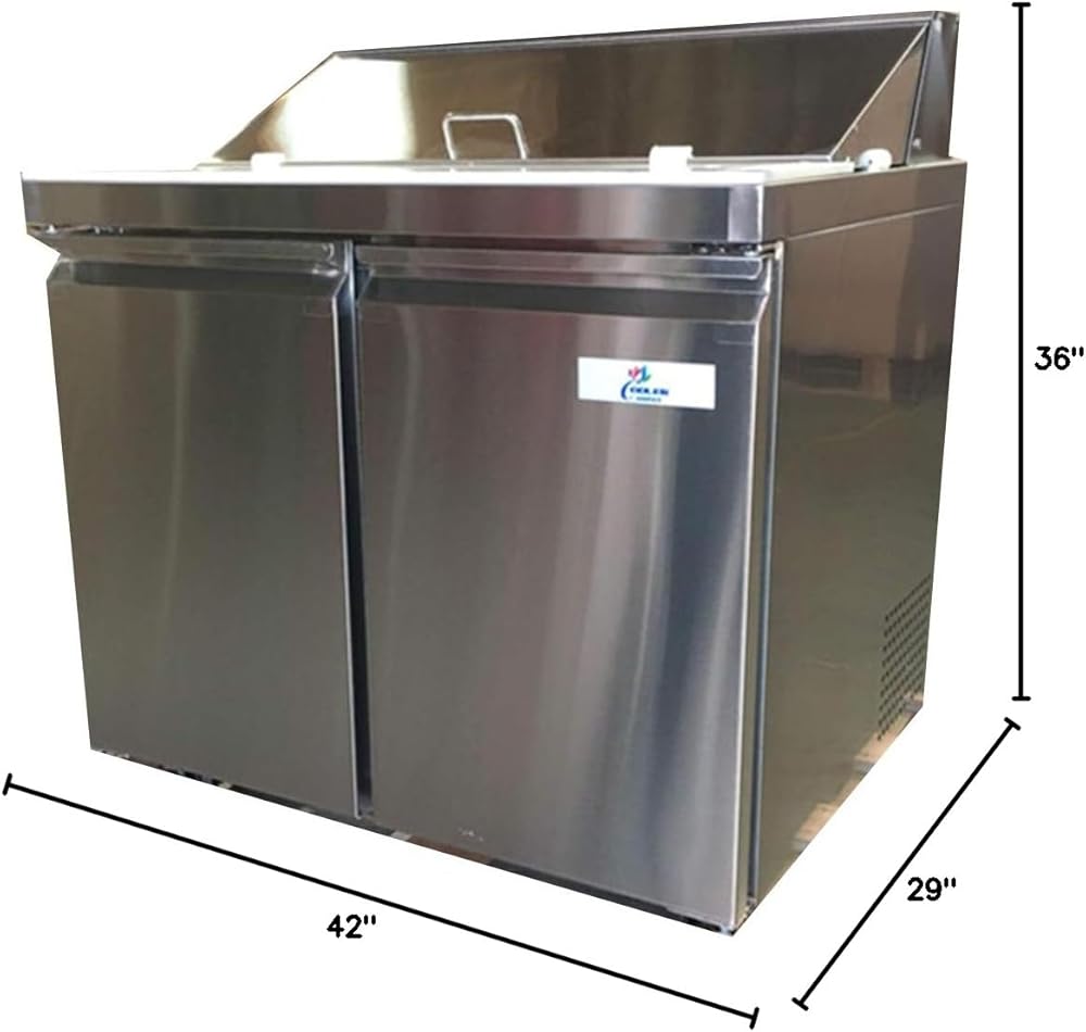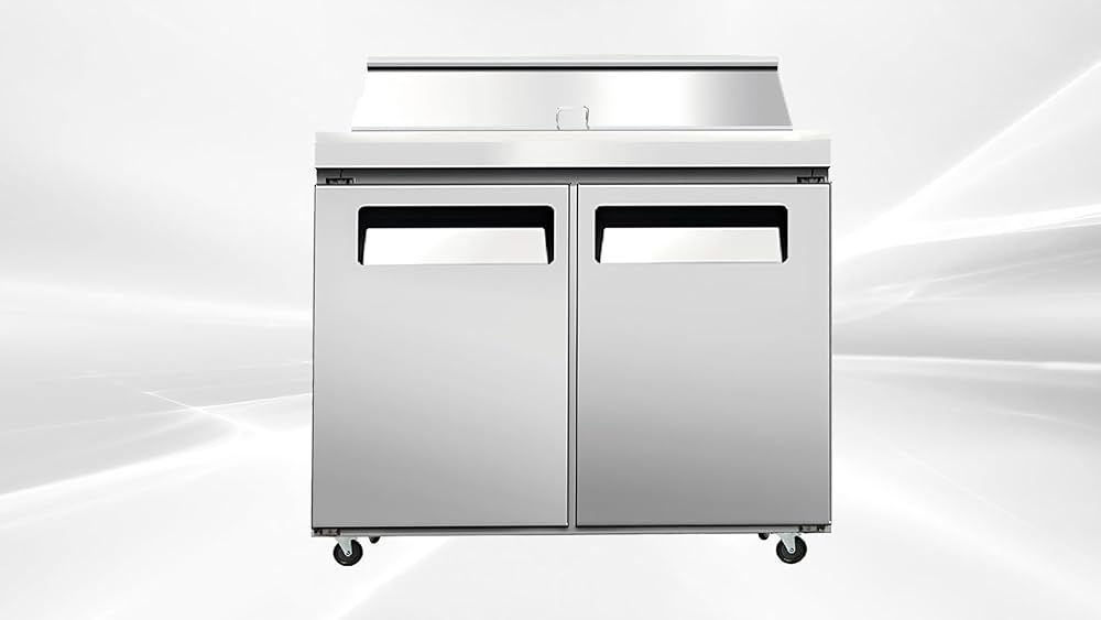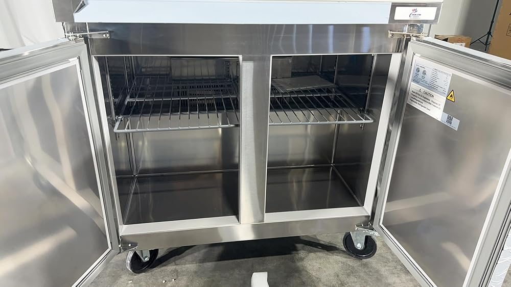 • REFRIGERATED STORAGE: Beneath the workspace is additional 8.6 cuft Two doors storage space. Because it's refrigerated at temperature of 33°F to 41 °F ( or 0°C to 5°C), the space is great for storing back-up ingredients, such as deli meat and cheese, as well as less common toppings. The epoxy-coated shelves are included and can each accommodate up to 90 lb. of weight, helping to organize your assorted supplies
