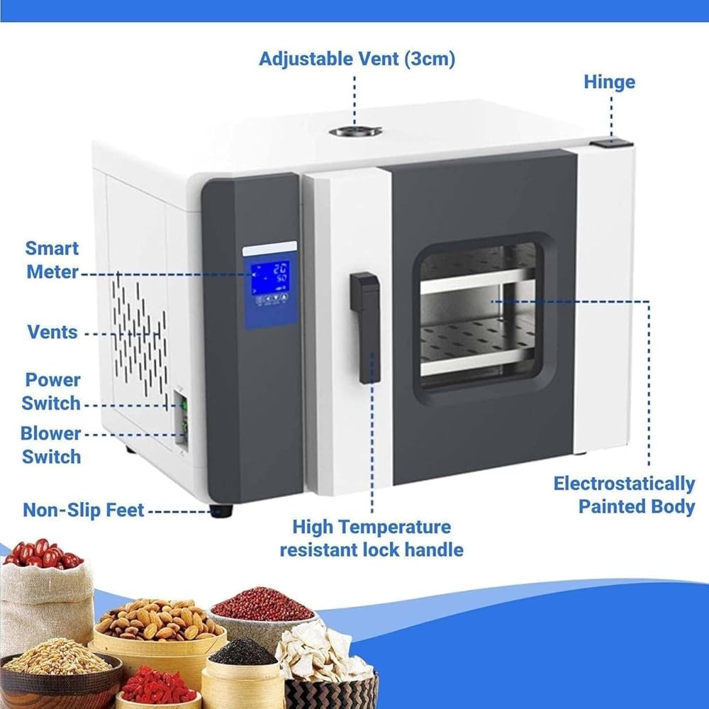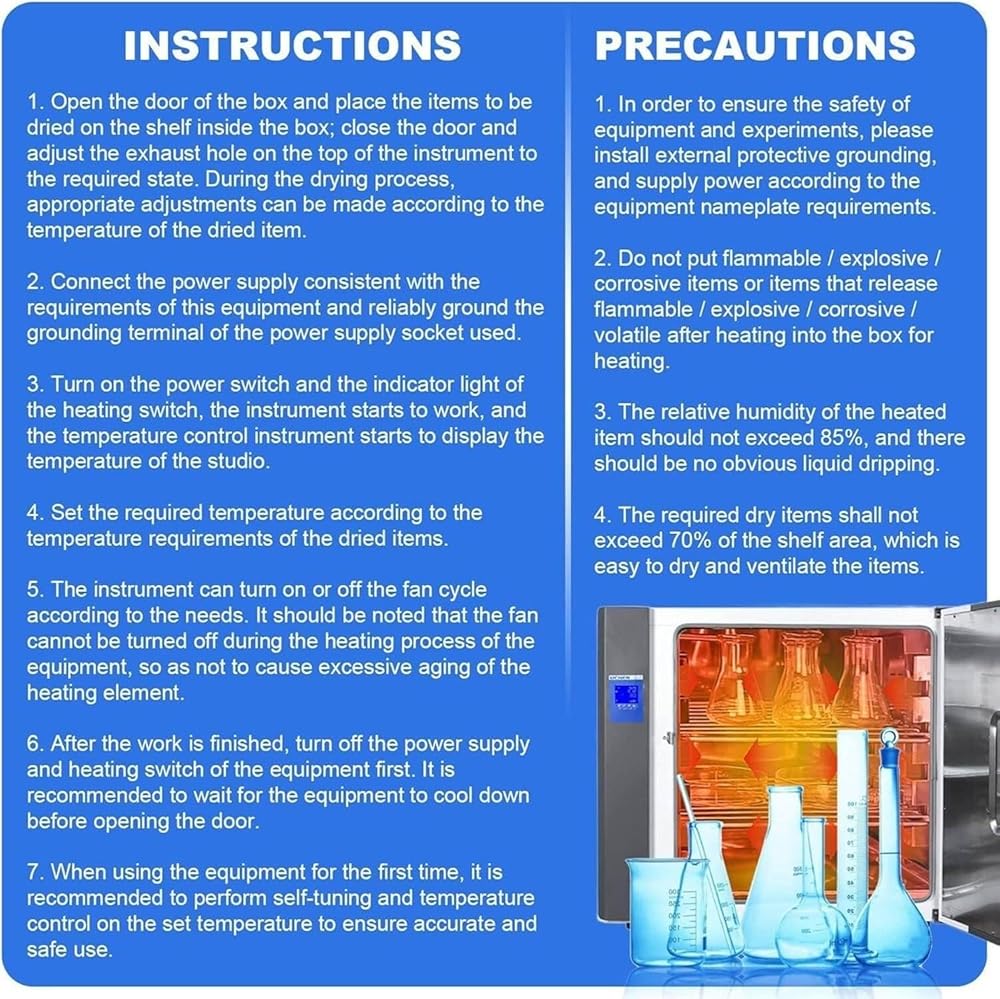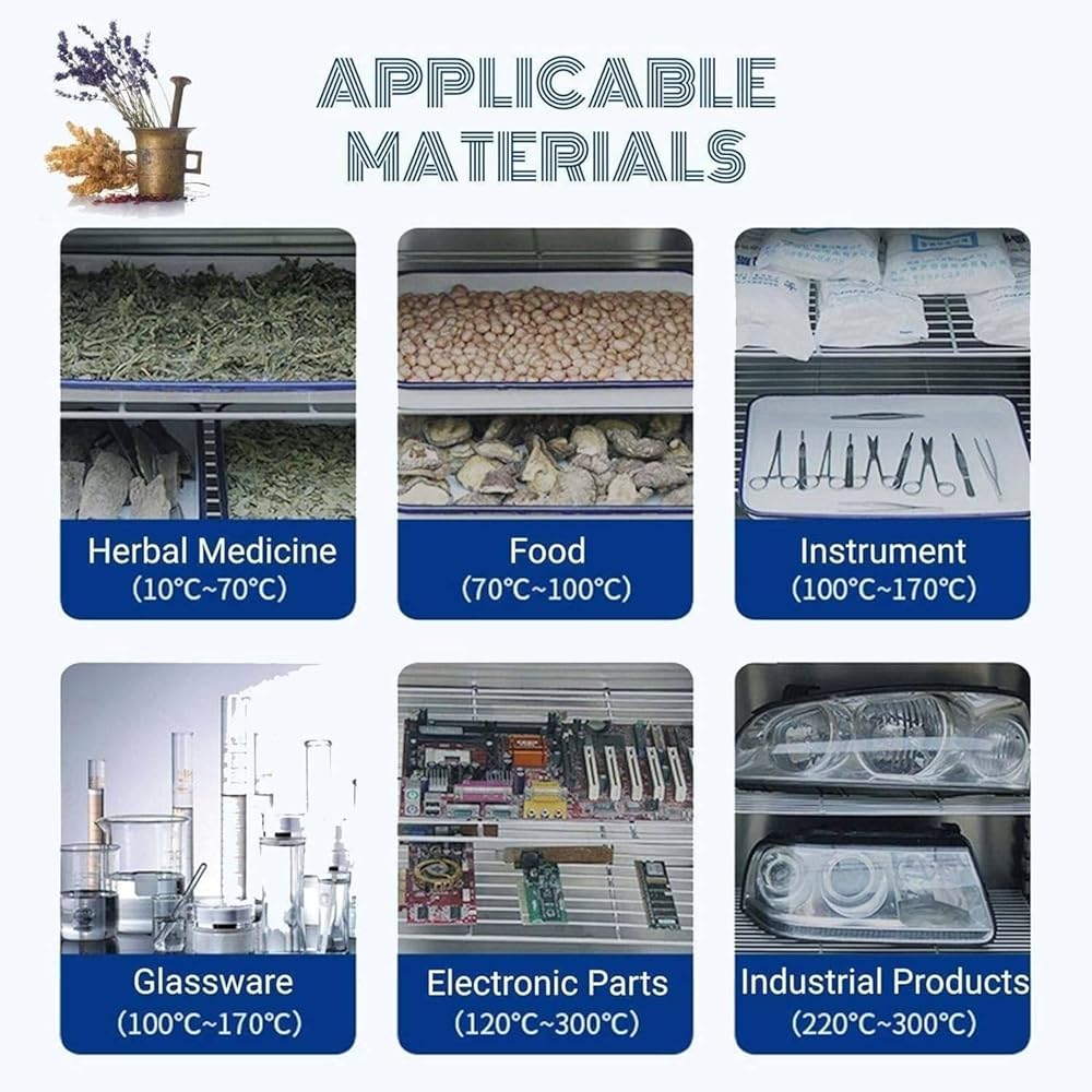 WIDE RANGE OF USES:The gravity convection drying oven is ideal for a variety of industries that require items to be baked or dried,cured,heat treated and high temperature tested,including electronics,agriculture,machinery and food.