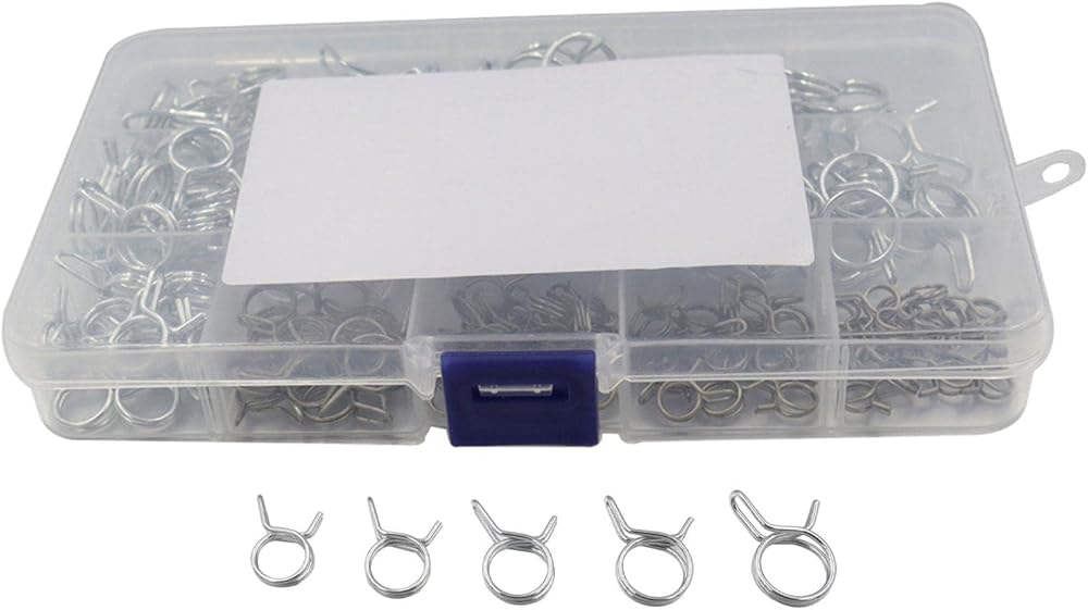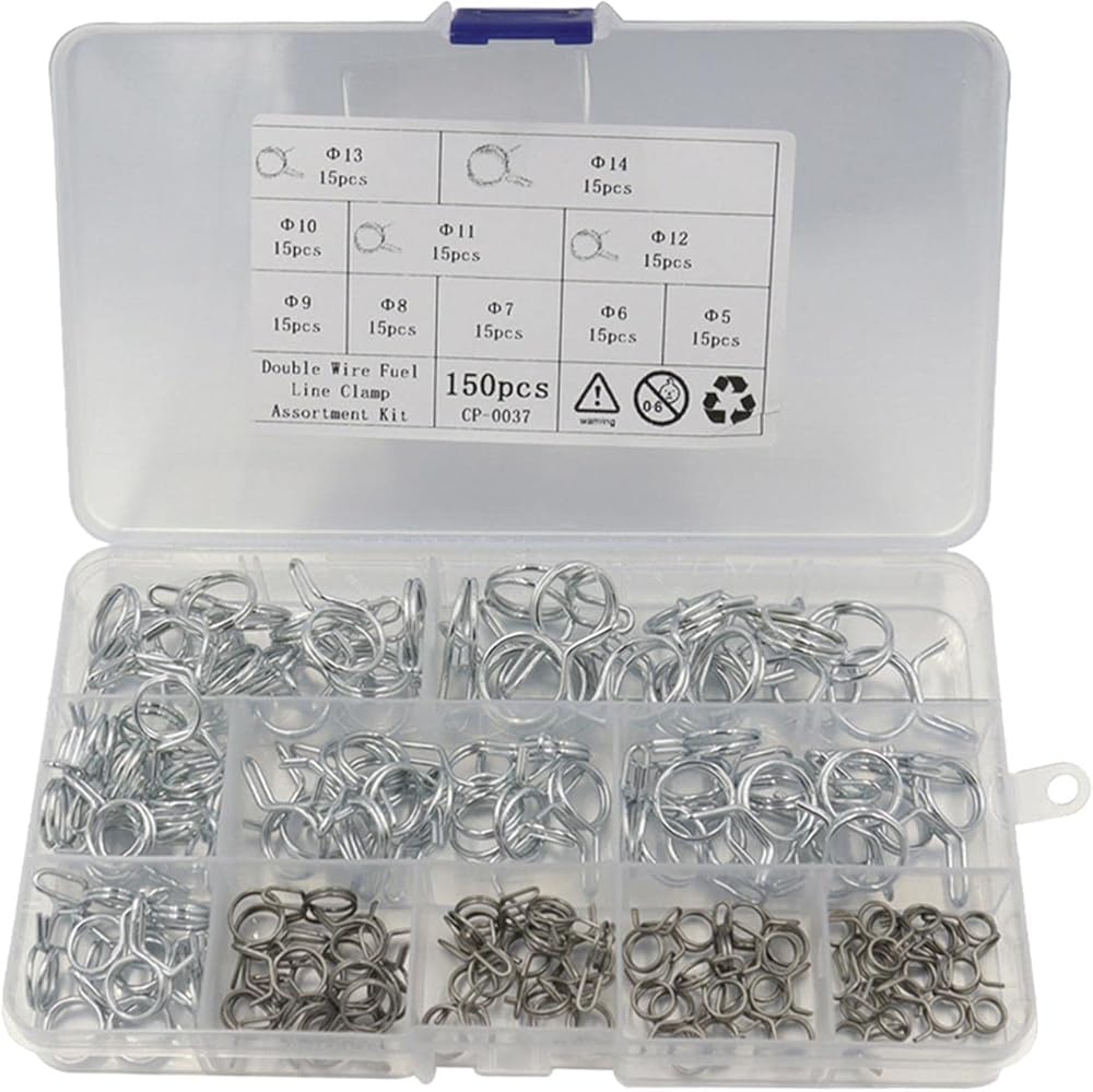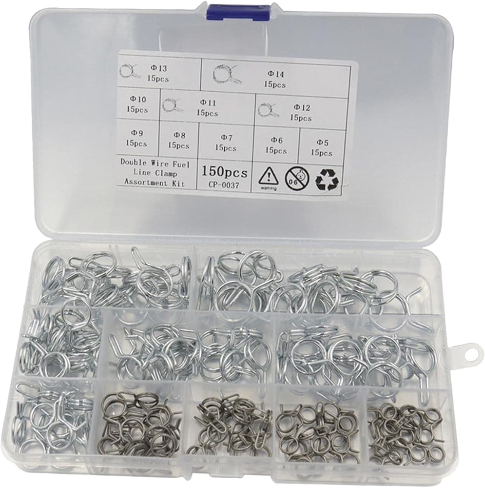 • 【Package Including】: 150 Pieces double wire spring hose clamp kit, including 10 values sizes, 15 pieces each: 5mm, 6mm, 7mm, 8mm, 9mm, 10mm, 11mm, 12mm, 13mm, 14mm.
