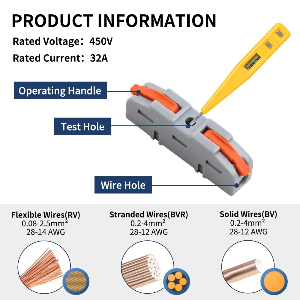 تطبيق واسع: يتوافق موصل السلك مع مقاييس الأسلاك المختلفة التي تتراوح بين 28-11 AWG، مما يجعله مناسبًا لمعظم احتياجات الأسلاك المنزلية، مثل الأضواء والمقابس والمفاتيح والصناديق الكهربائية أو المعدات الكهربائية الأخرى.