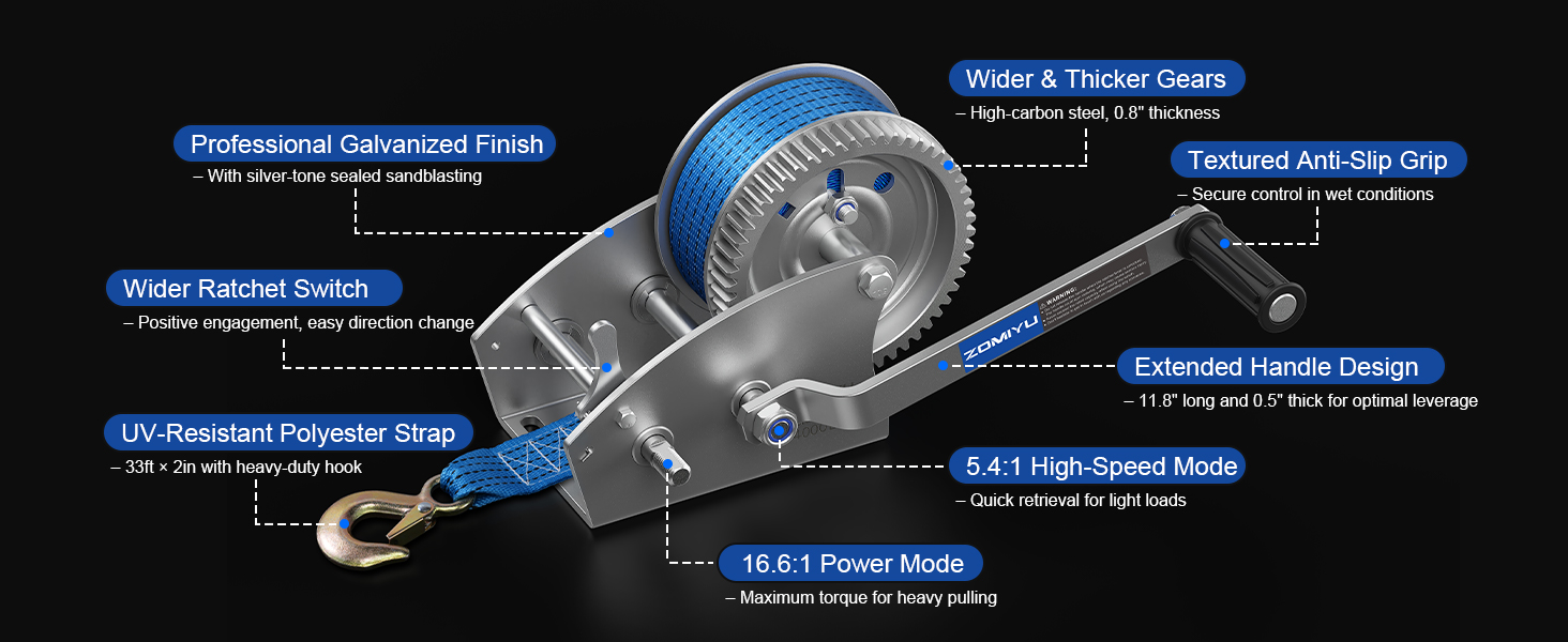 ونش مقطورة قارب 4000 رطل مع حزام، سقاطة ثنائية الاتجاه 5.4:1/16.6:1 نسبة تروس، ترس معزز، مفتاح سقاطة ومقبض، ونش يدوي عالي التحمل للقارب، المقطورة، ATV، البحرية، جت سكي