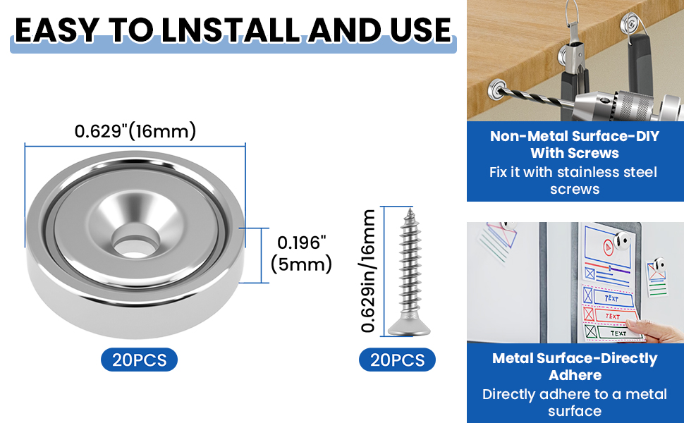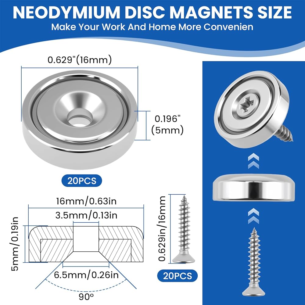 𝐖𝐡𝐚𝐭 𝐘𝐨𝐮 𝐆𝐞𝐭: سوف تحصل على 20 قطعة من مغناطيس أكواب النيوديميوم، و20 قطعة من البراغي المصنوعة من الفولاذ المقاوم للصدأ. توفر هذه المجموعة الكاملة كل ما يلزم للتركيب الفوري وعقد المهام