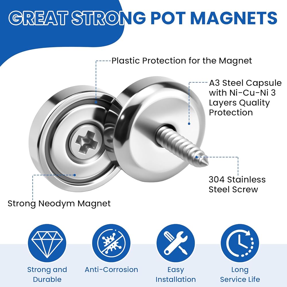 𝐓𝐰𝐨 𝐈𝐧𝐬𝐭𝐚𝐥𝐥𝐚𝐭𝐢𝐨𝐧 𝐖𝐚𝐲𝐬: تحتوي مغناطيسات أكواب النيوديميوم على 20 قطعة براغي، استخدم البراغي لتثبيت المغناطيس على أي شيء، أو استخدم المغناطيس مباشرة على السطح المعدني. اجعلها سهلة الاستخدام. المغناطيس الغاطس مصنوع من عملية الطلاء الكهربائي، والتي تتمتع بأداء مستقر في بيئات مختلفة
