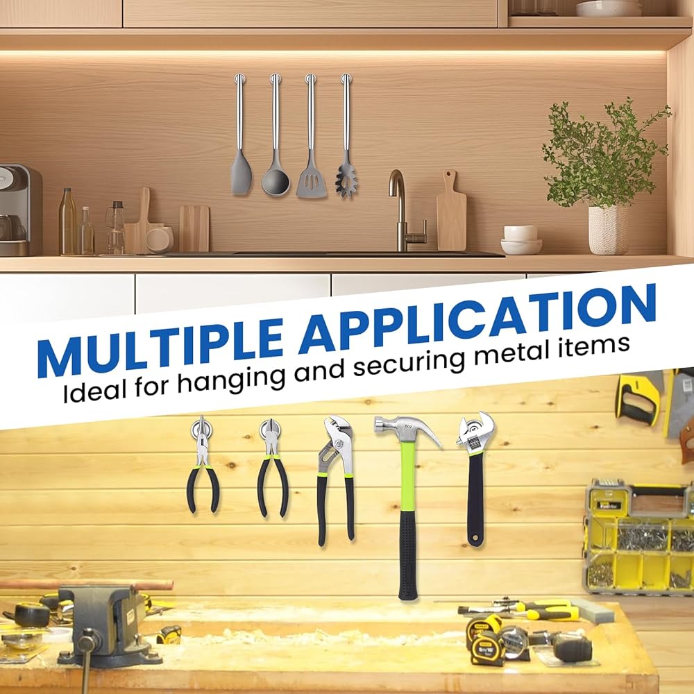 𝐌𝐮𝐥𝐭𝐢𝐩𝐥𝐞 𝐀𝐩𝐩𝐥𝐢𝐜𝐚𝐭𝐢𝐨𝐧: مثالية لتعليق العناصر المعدنية وتأمينها: تستخدم كمغناطيس للثلاجة، أو مغناطيس للخزانة، أو حاملات تخزين الأدوات في المرائب/ورش العمل؛ إصلاح التقويمات أو الخرائط أو لوحات المسح الجاف في المكاتب/الفصول الدراسية؛ أو دعم مشاريع النجارة