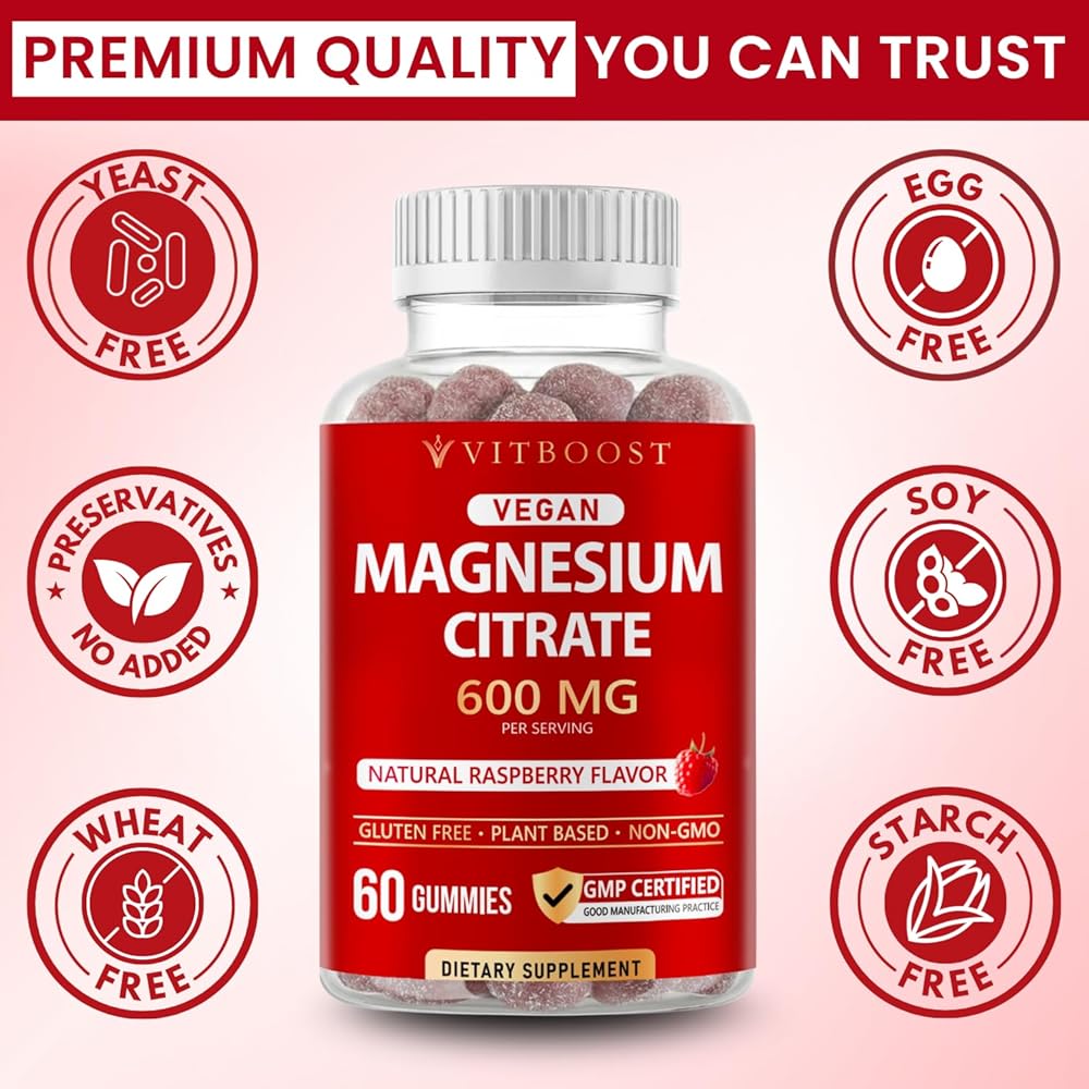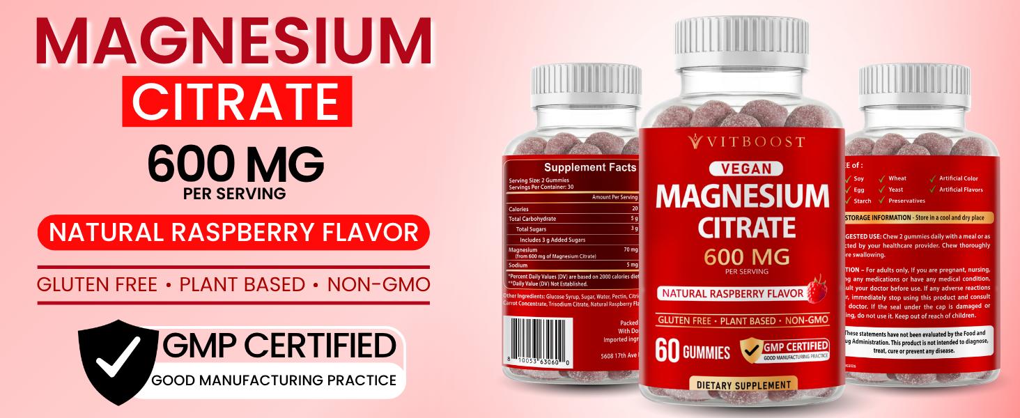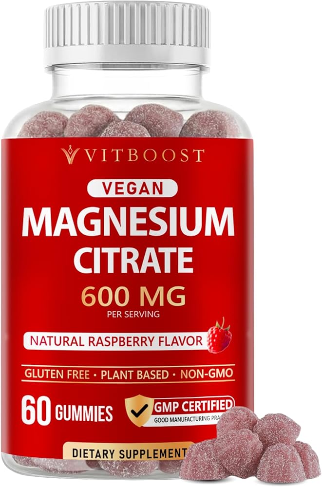 Vitboost Magnesium Citrate Gummies 600mg - 60 Count Magnesium Gummies للاسترخاء ودعم العضلات - نكهة التوت الطبيعية - غير معدلة وراثيًا، خالية من الغلوتين، نباتية
