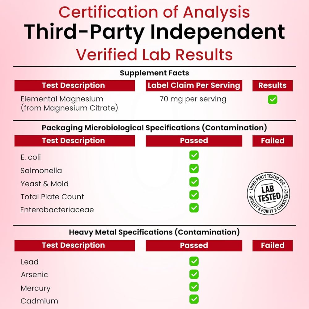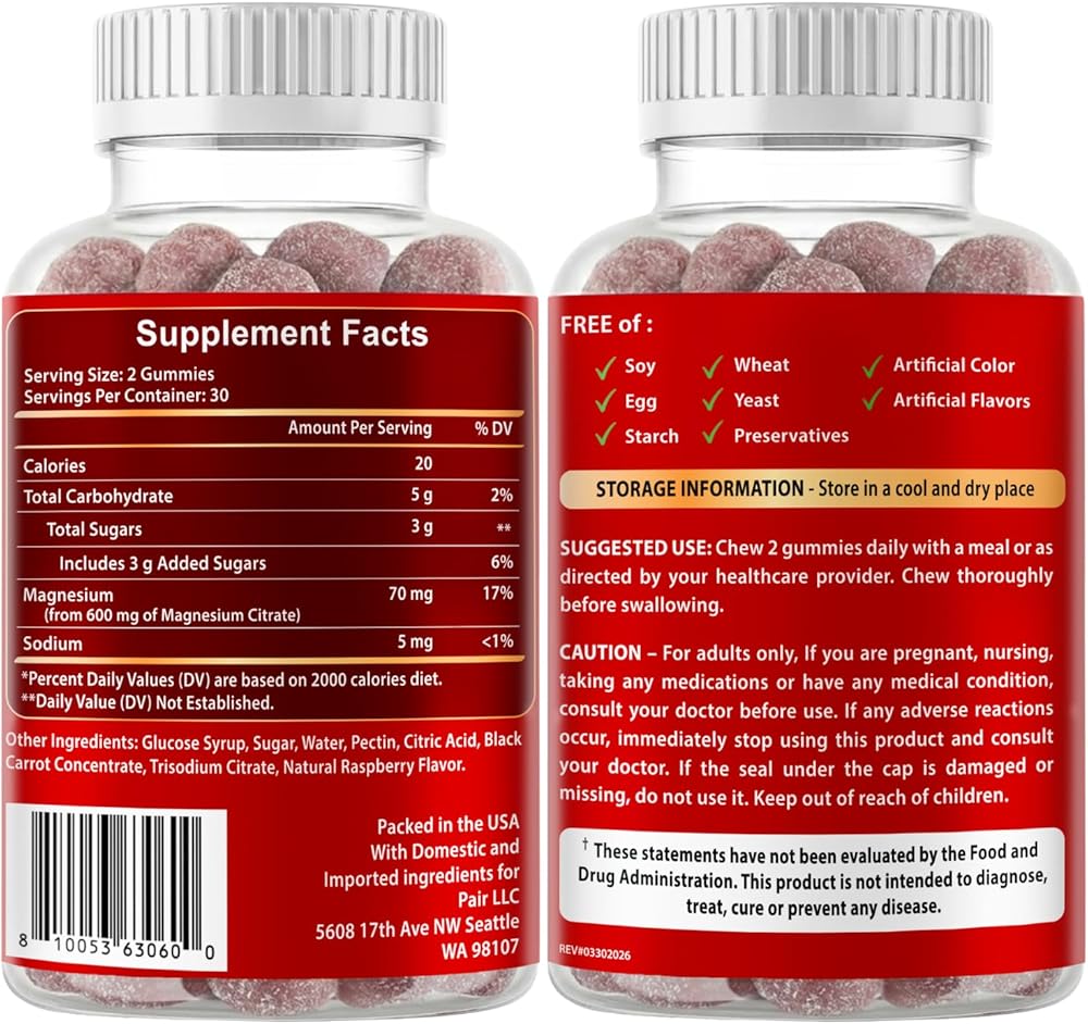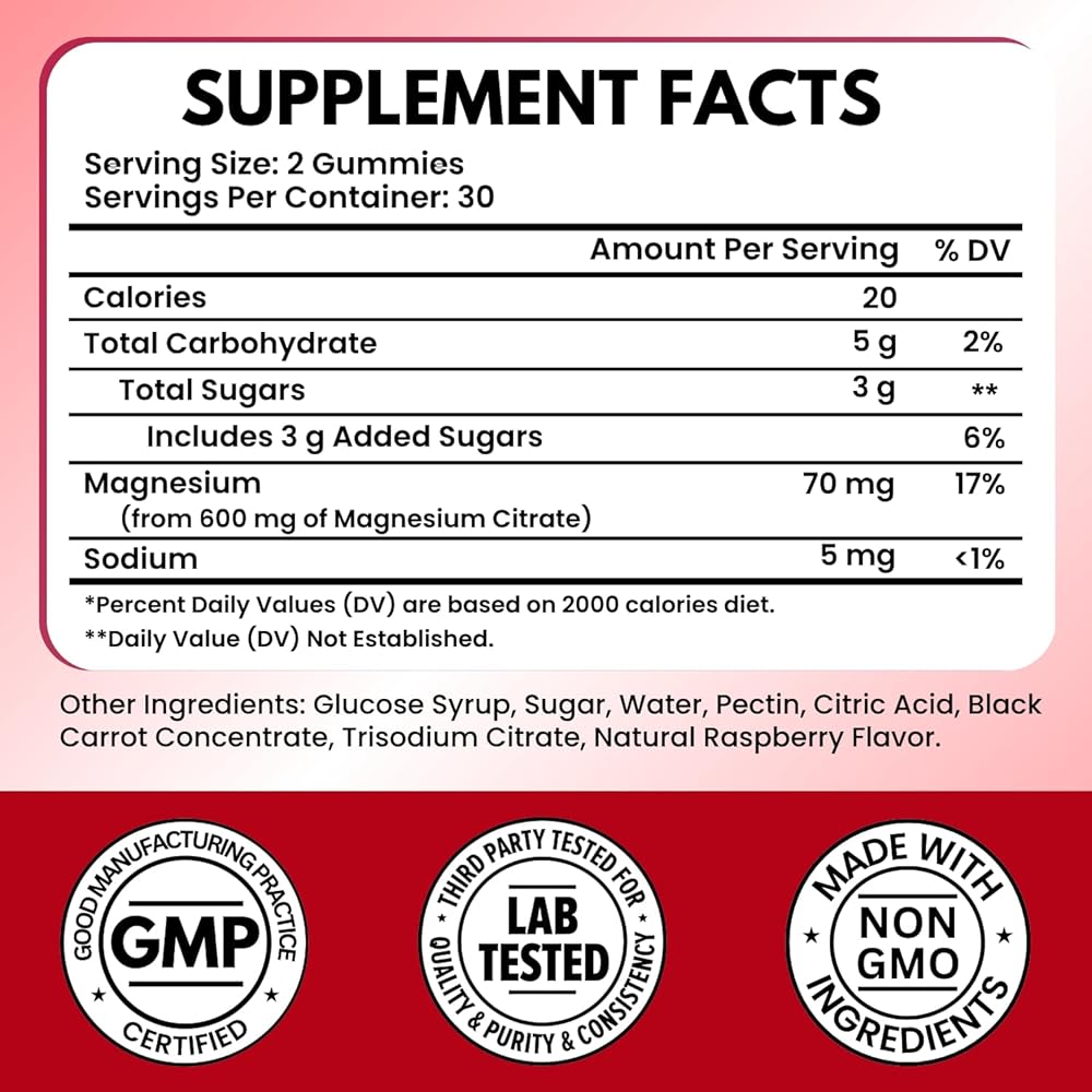 • تركيبة نباتية ونباتية: كل علكة سيترات المغنيسيوم مركبة من البكتين النباتي ومكونات غير معدلة وراثيًا، وهي خالية من الغلوتين وفول الصويا والقمح والخميرة والألوان الاصطناعية.