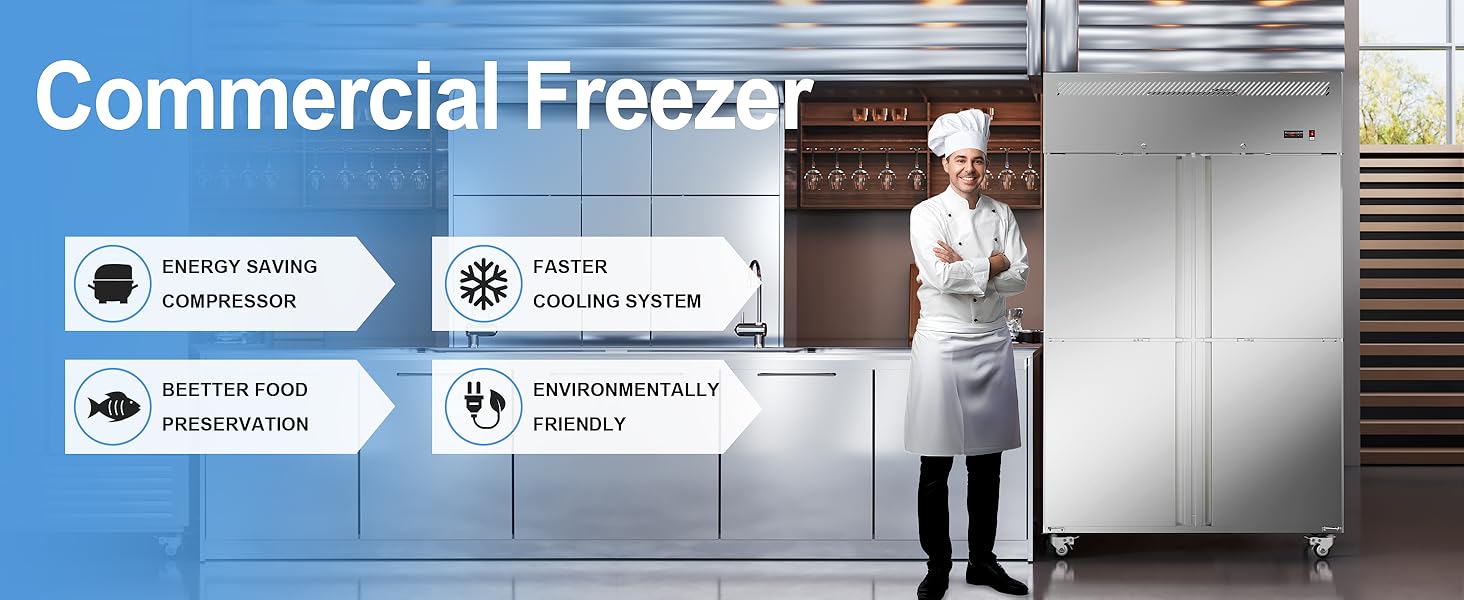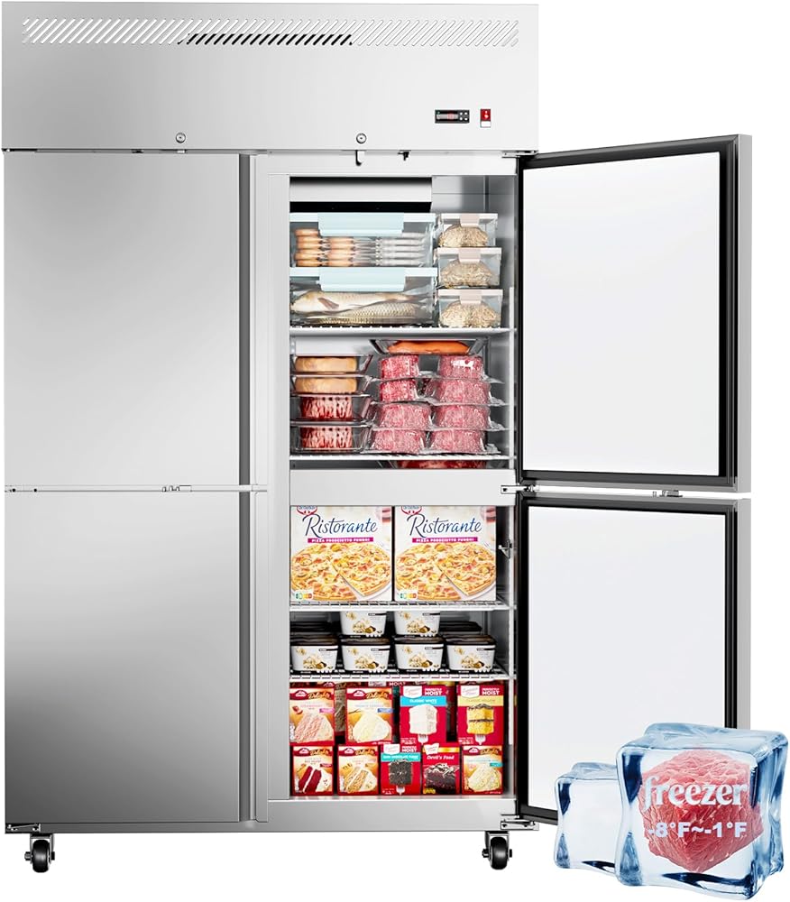 سعة تخزين كبيرة: تعمل الأبواب الأربعة على تعزيز التنظيم من خلال إعطائك سهولة الوصول إلى أقسام مختلفة، مع تحسين كفاءة الطاقة أيضًا عن طريق الحد من المنطقة التي يجب فتحها. مع مساحة تبلغ 36 قدمًا مكعبًا و8 أرفف قابلة للتعديل، يعد هذا الفريزر التجاري مثاليًا لتخزين المواد الغذائية الكبيرة. يمكن لكل رف أن يدعم ما يصل إلى 77 رطلاً (35 كجم)، مما يحافظ على المكونات منظمة بشكل أنيق ويمكن الوصول إليها بسهولة.