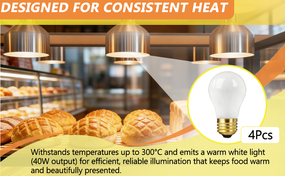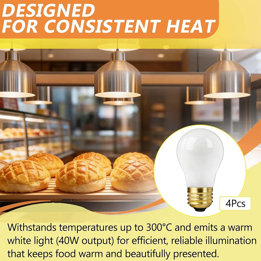 لمبة تسخين الطعام: ينبعث منها توهج أبيض دافئ (خرج 40 واط) يعزز عرض الطعام مع توفير حرارة ثابتة. مثالية للاستخدام في البوفيهات والأطعمة الجاهزة والمطابخ التجارية