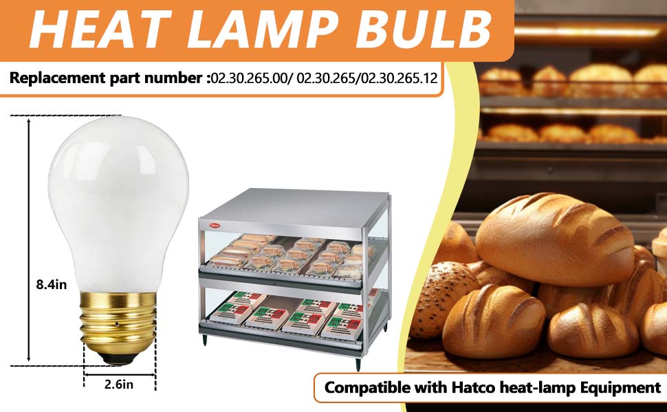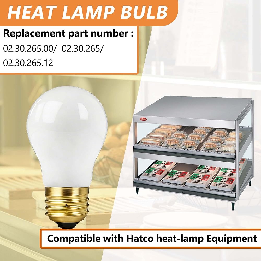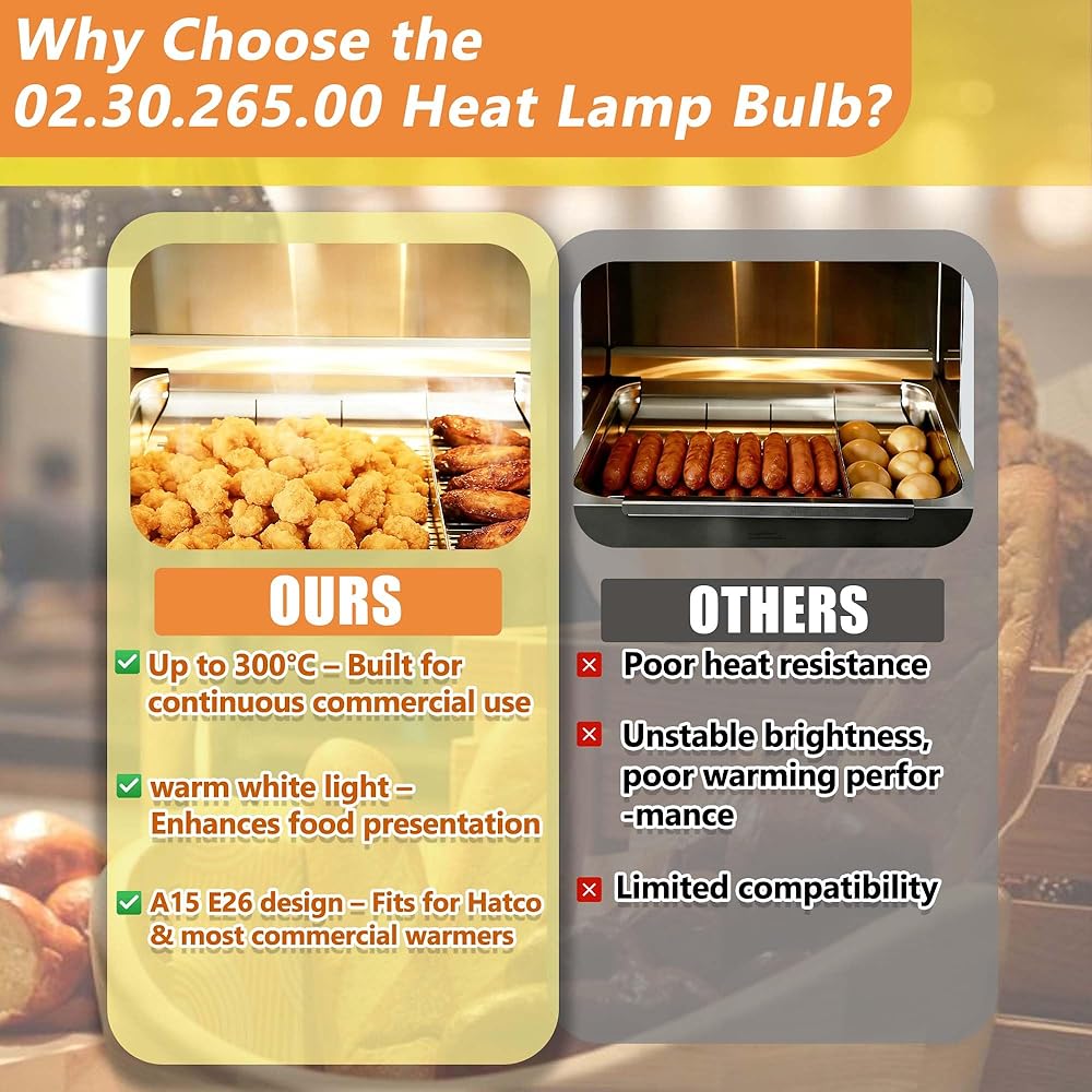 توافق واسع: مصمم كبديل مباشر لمصابيح Hatco الحرارية، متوافق مع أرقام الأجزاء 02.30.265.00، 02.30.265، و02.30.265.12. مثالية لسخانات وأفران الطعام من هاتكو التي تتطلب لمبة 40 وات