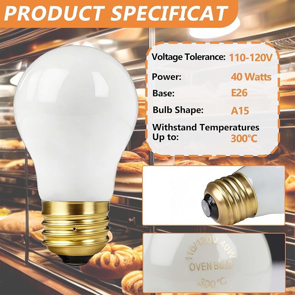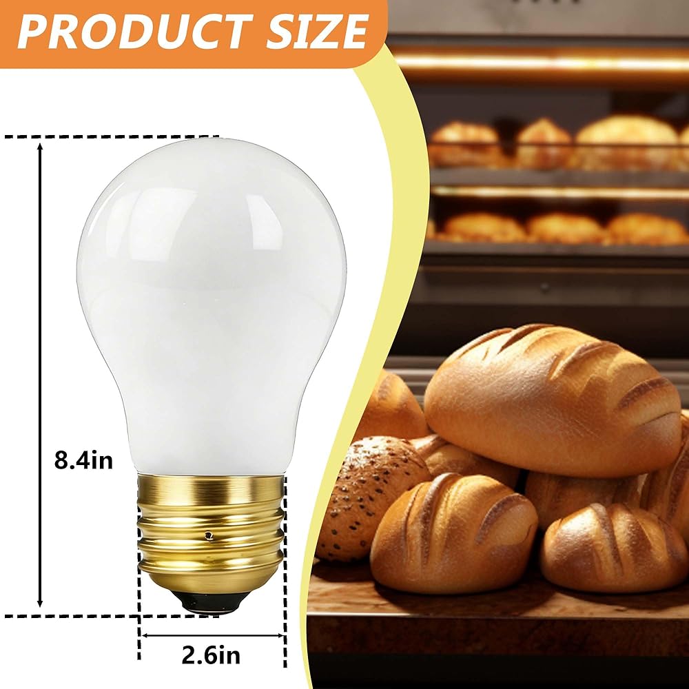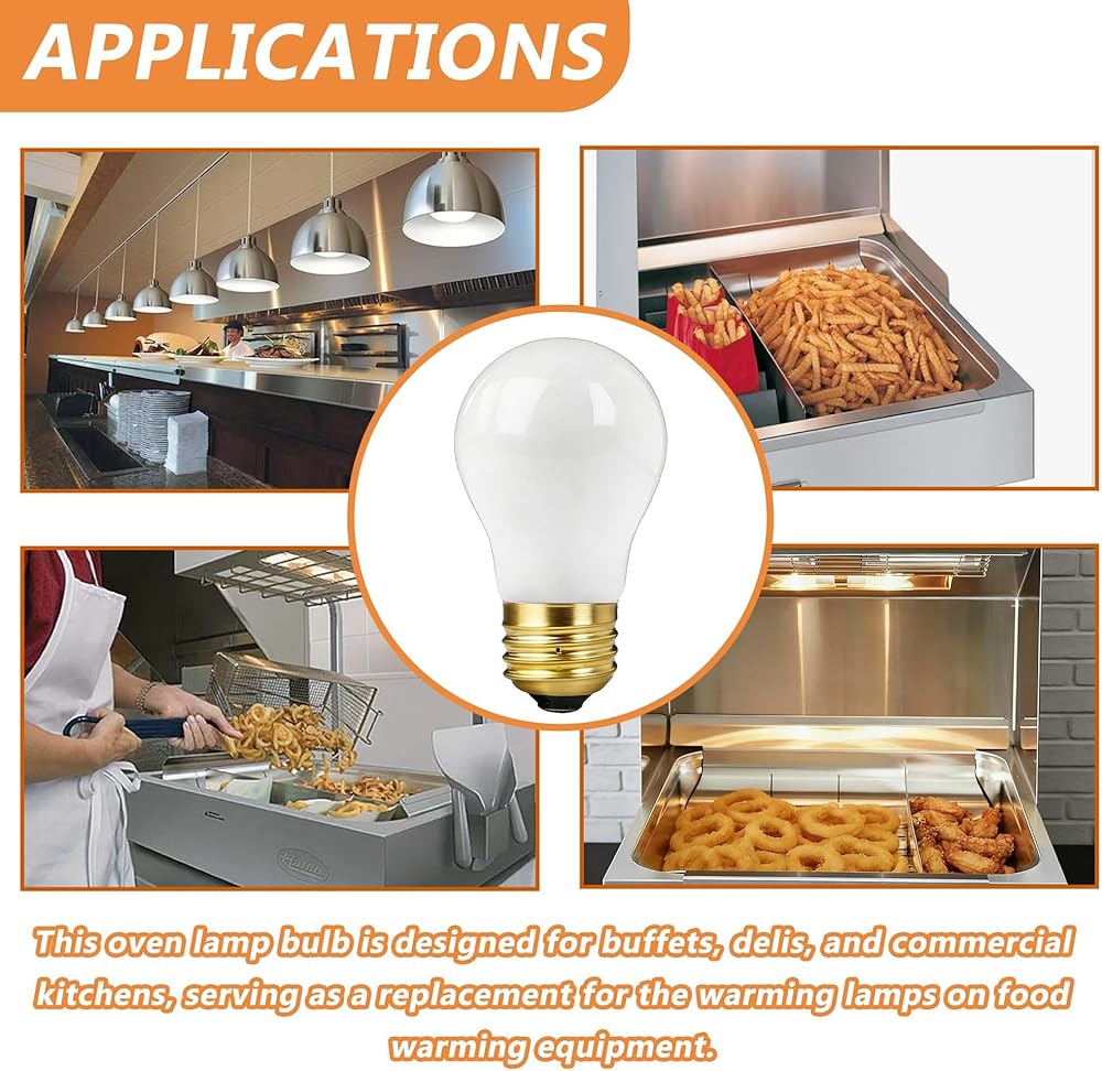 مواصفات المنتج: يتميز بشكل لمبة A15 مدمجة وقاعدة متوسطة E26 قياسية، مما يضمن ملاءمة آمنة لمعظم معدات تسخين الطعام التجارية دون الحاجة إلى محولات أو تعديلات