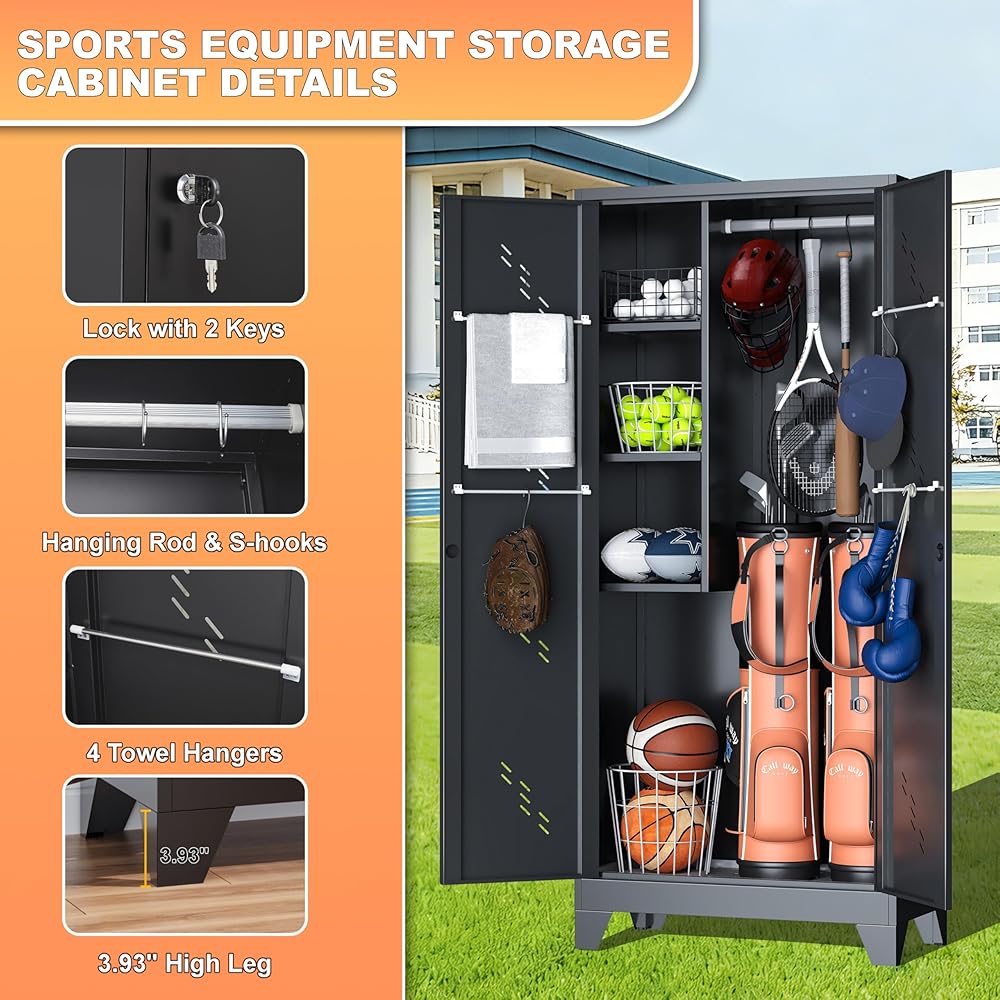 【خزانة تخزين معدنية شديدة التحمل】مصنوعة من الفولاذ الفاخر مع لمسة نهائية مطلية بالمسحوق، يقاوم منظم المعدات الرياضية للجراج الخدوش والصدأ للاستخدام طويل الأمد - أكثر متانة من الخزانة الخشبية التقليدية. الأبعاد: 16.5 بوصة عمق × 33.8 بوصة عرض × 75 بوصة ارتفاع