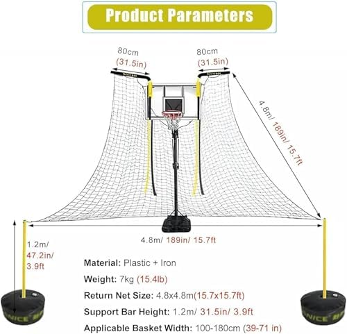 Manufacturer:?Whether you're a beginner learning basketball or a professional athlete looking to practice your shooting skills our ball return automatic nety is the ideal choice to increase your training time capture all the shots reduce the time of chg the basketball greatly improve the number of shots enhance muscle memory improve the shooting rate improve the efficiency of shooting training. Parameters - Material: steel and high-density woven mesh - Size: 4.8m x 4.8m (15.7ft x 15.7ft) - Weight: 7kg (15.4lbs) - Applicable Basket Width: 100-180cm (39-71 in) Features - Save the ball pickup step improve training efficiency. - 180rotation suitable for shooting at various angles - No obstruction of vision or basketball trajectory. - Time-saving & Keep Shooting Easy to install and disassemble - Durable steel material & highdensity woven mesh Included 1x basketball returns net (with installation complete kit) Note: - If you have any specific product queries please contact ours - Manual measurement product size may exist 1 2 cm error - Products are taken in kind but due to light equipment shooting angle and resolution of the computer there will be small color difference in kind prevail