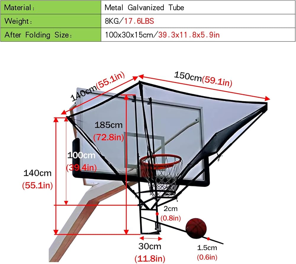 : Basketball rebound net weighs about 8KG/17.6LBS; the folded size is 100x30x15cm/39.3x11.8x5.9inWhen not in use put it into the storage bag easy to carry and transport.