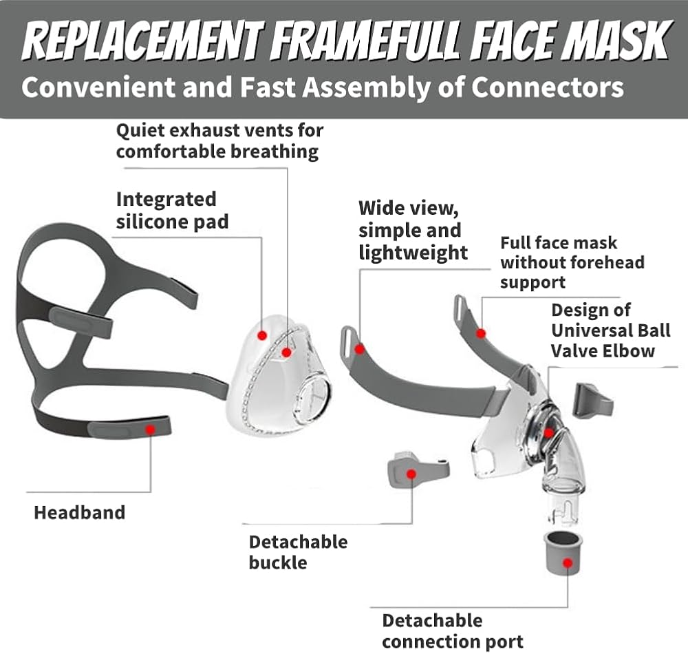 【قناع CPAP لكامل الوجه】التنفس عن طريق الفم أو التنفس المختلط يمكن أن يجعل أقنعة الأنف غير قابلة للاستخدام. يغطي قناع CPAP لكامل الوجه الأنف والفم، ويحافظ على إحكام موثوق به عند أي ضغط لتدفق الهواء، ويناسب جميع ملامح الوجه بشكل مريح ويحسن الجودة الإجمالية للعلاج.