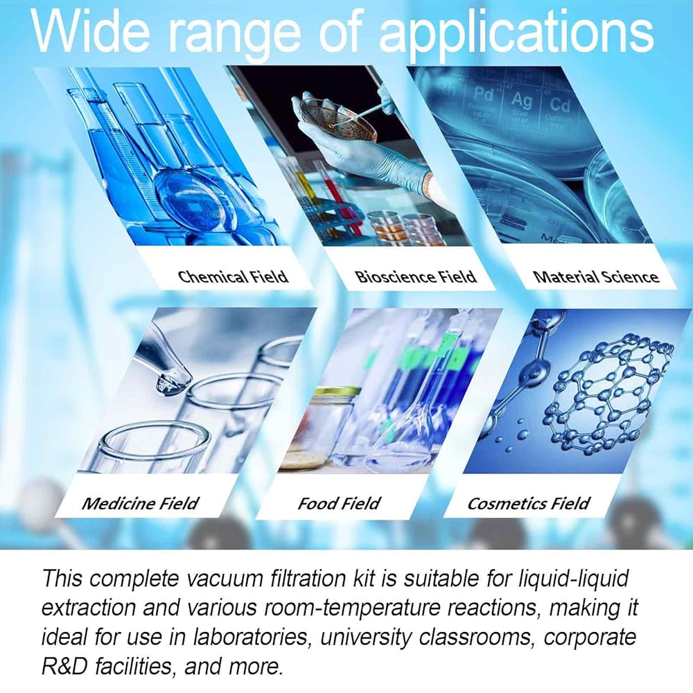 • Versatile Applications: This complete vacuum filtration kit is suitable for liquid-liquid extraction and various room-temperature reactions, making it ideal for use in laboratories, university classrooms, corporate R&D facilities, and more.
