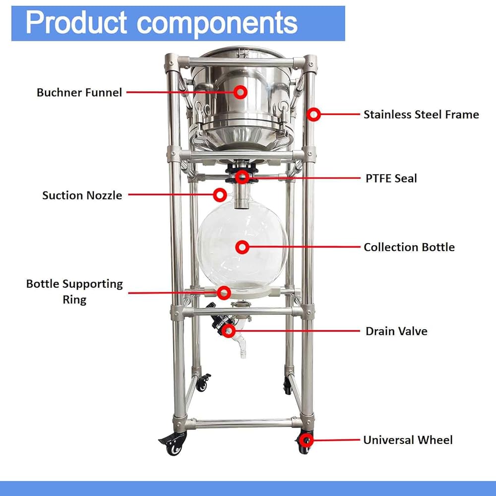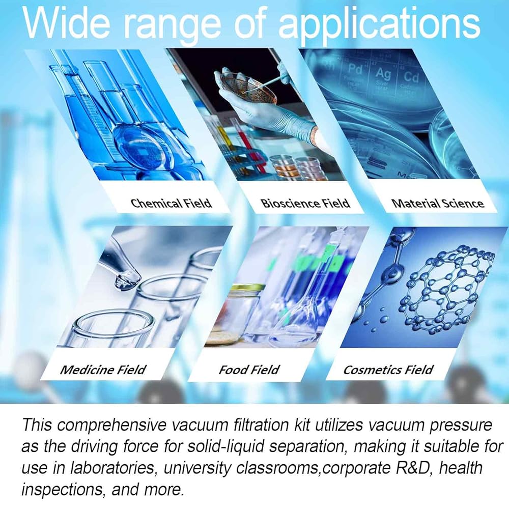 Versatile Applications: This comprehensive vacuum filtration kit utilizes vacuum pressure as the driving force for solid-liquid separation, making it suitable for use in laboratories, university classrooms, corporate R&D, health inspections, and more.