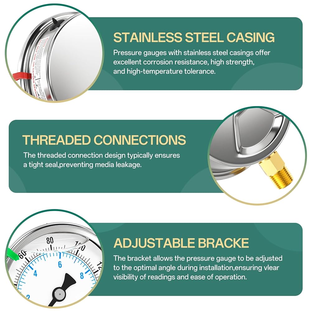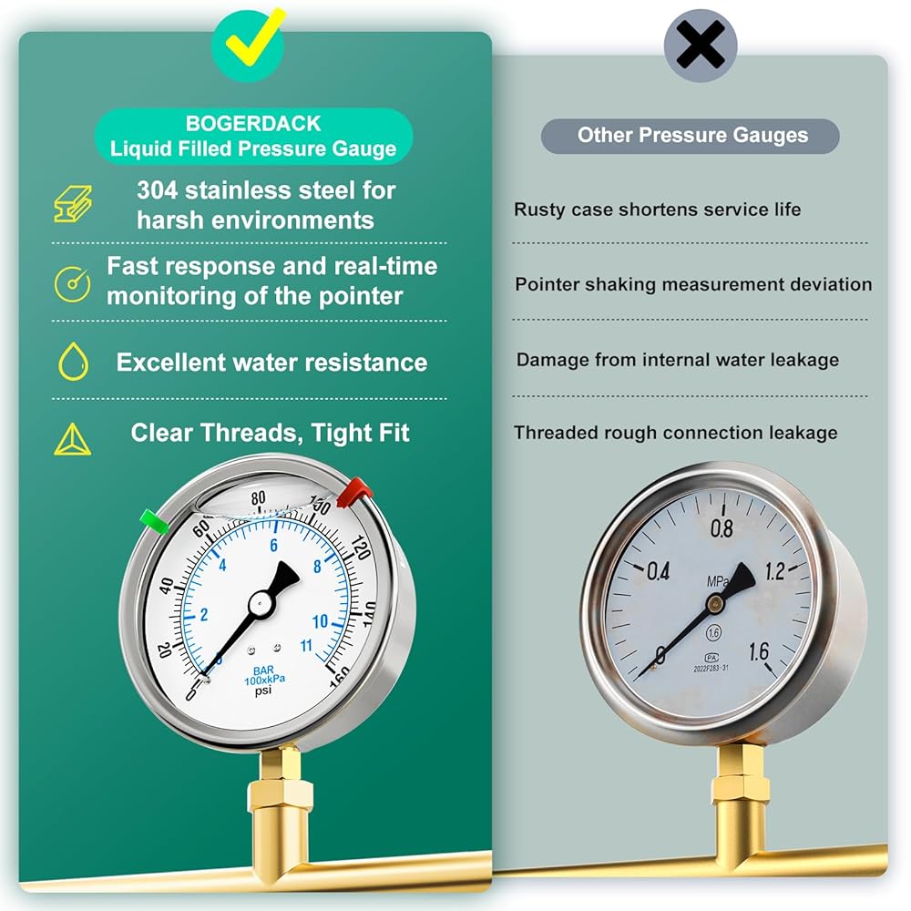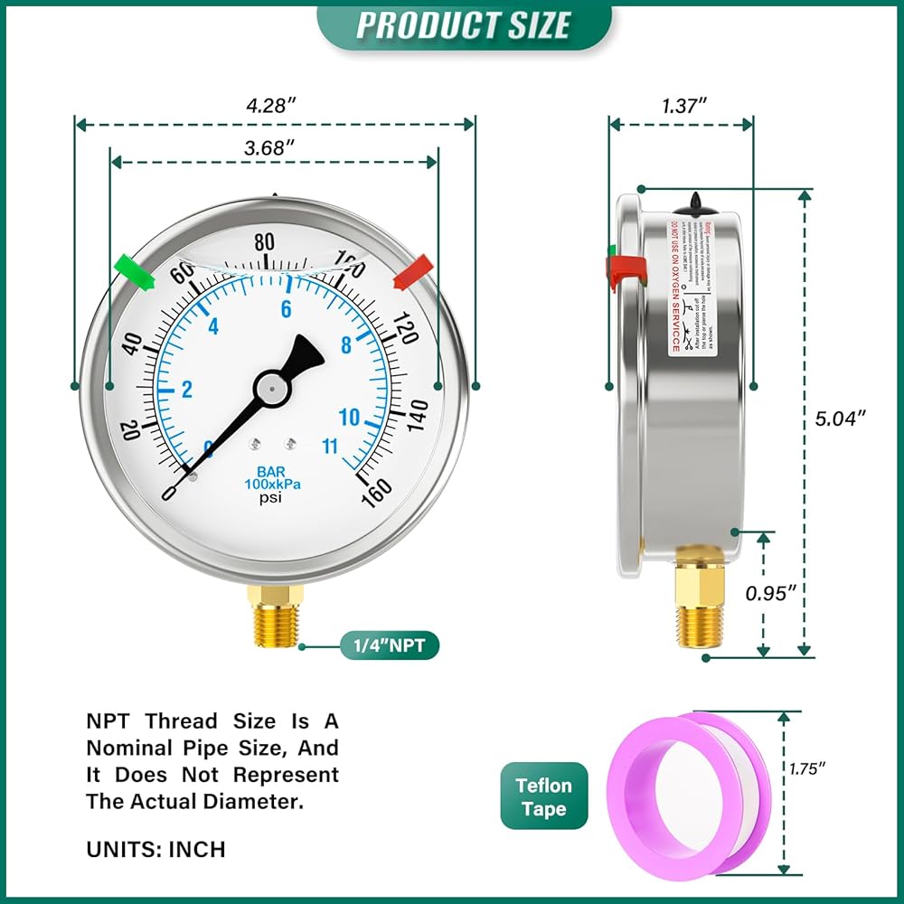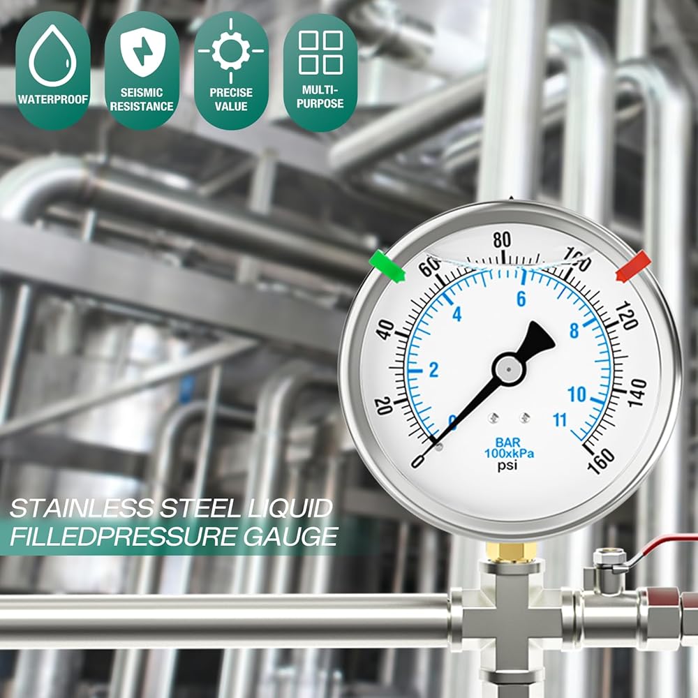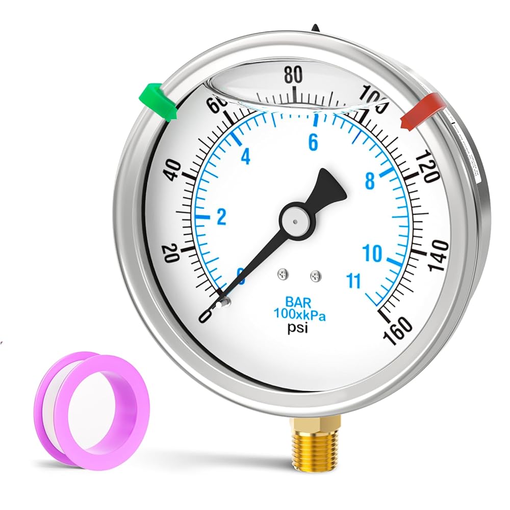 مقياس ضغط مملوء بالسائل من الفولاذ المقاوم للصدأ 0-160 رطل لكل بوصة مربعة، مقاس قرص 4 بوصة، حامل سفلي 1/4 بوصة NPT، للأنبوب، مضخة المياه، الغاز، السائل، اختبار الضغط (مع مؤشر علامة النطاق)