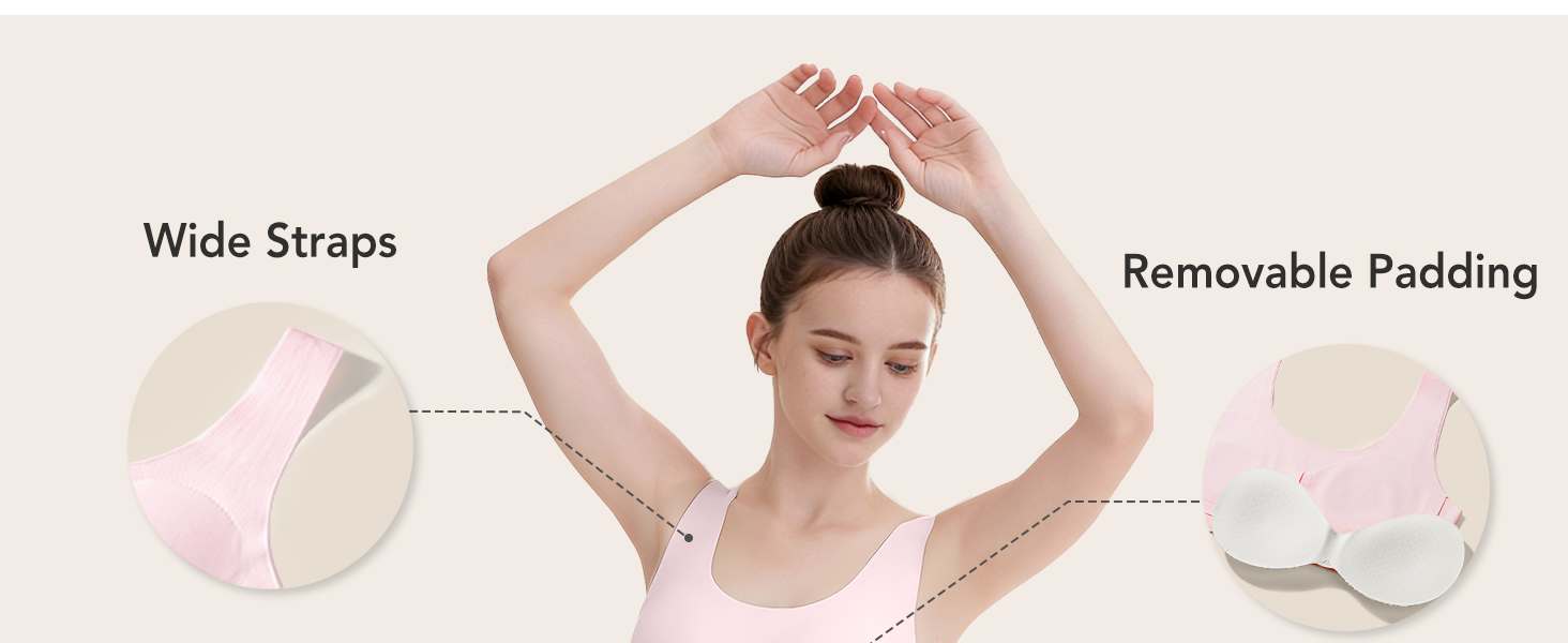 حمالات صدر للفتيات مبطنة قابلة للإزالة: حمالات الصدر الخاصة بنا للمراهقين مصنوعة من حشوة ثلاثية الأبعاد، والتي توفر رعاية خاصة لنمو الصدر لدى الفتيات اللاتي تتراوح أعمارهن بين 14 و16 عامًا. يمكن إزالة أكواب حمالة الصدر المستقلة لتناسب تفضيلاتك.