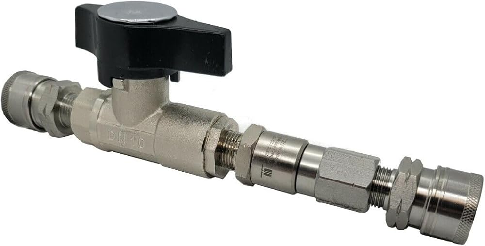 This Ball Valve is used for Pressure Washing and SoftWashing applications. It comes with the DN10 ball valve, a stainless steel Mosmatic Swivel and two stainless steel 3/8" quick connects.