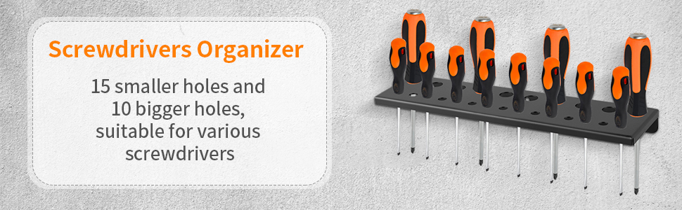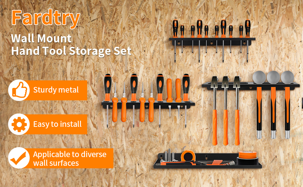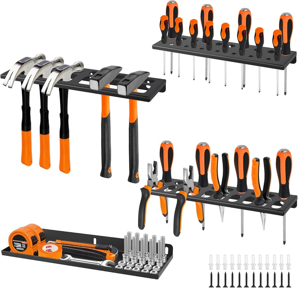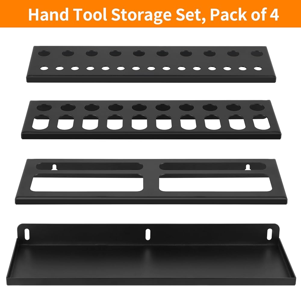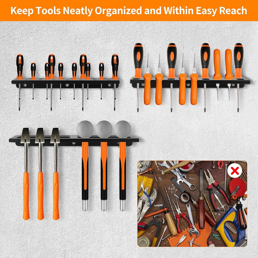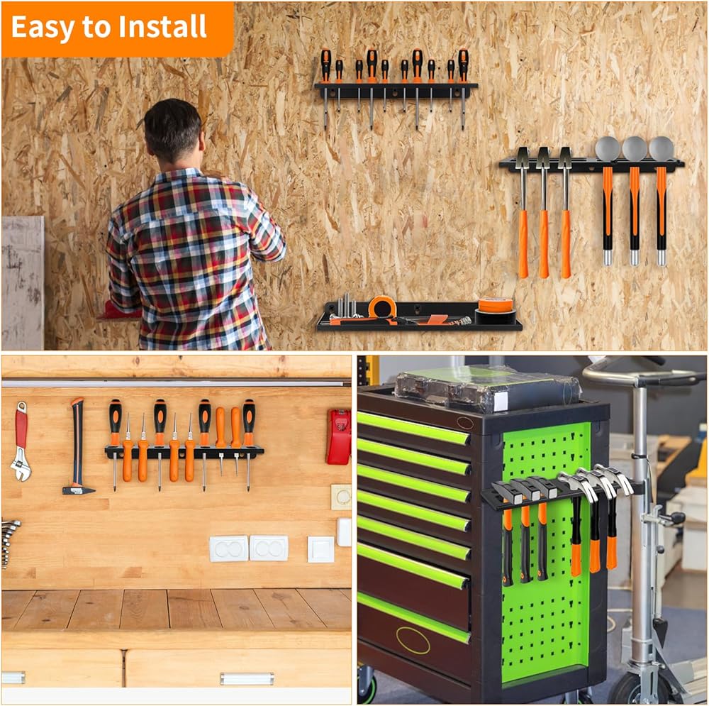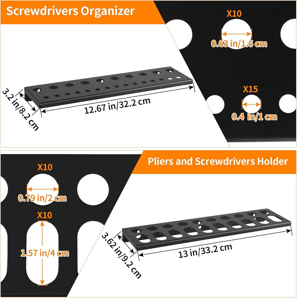 منظم متعدد الأدوات: مجموعة تخزين الأدوات اليدوية تتضمن 1 منظم مفك براغي، 1 حامل كماشة، 1 رف مطرقة و1 رف تخزين الأجهزة، تنظيم الأدوات المختلفة بشكل مثالي (الأدوات الموضحة في الصور غير متضمنة)