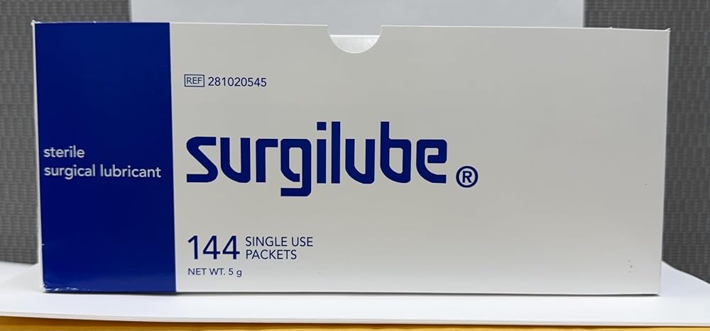 Surgilube Lubricating Jelly is a water-soluble, sterile product packaged in 5 g single-use foil packets. Designed for smooth application during procedures requiring internal access or external device insertion, it provides consistent glide without leaving residue. The formula is compatible with most materials, including natural and synthetic rubber and plastics, and is stable under standard storage conditions. Each packet is individually wrapped for hygienic use and ease of dispensing. This bulk box contains 144 single-use sterile packets, ideal for use in controlled environments requiring single-application lubrication.