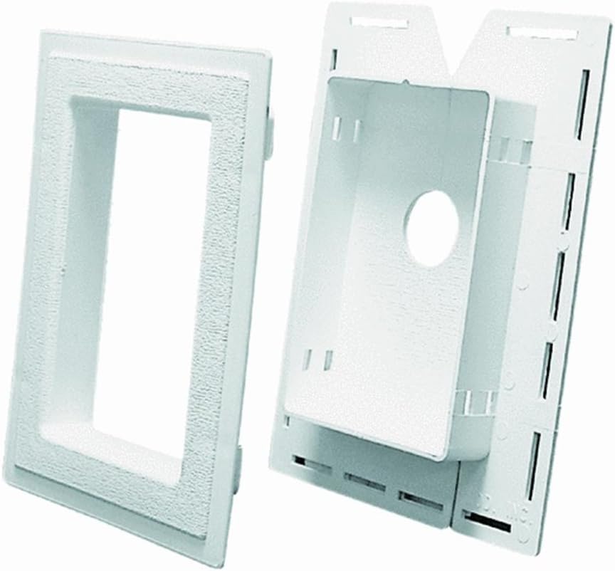 The split recessed J-Block mounting block has a patented hinge that allows for ease of installation without removal of electrical receptacles and water faucets. Manufactured with ultraviolet-stabilized color, minimizing the effects of exposure to the elements. Compatible with all siding profiles. Rich textured appearance. Surface dimensions: 5-1/4" x 7". Flange dimensions: 5-7/8" x 7-1/2". J-Channel internal dimension: 3/4" adjusts to 1-1/4". Knockouts: Rectangle 2-1/4" x 3-7/8". No. MBLOCKR PW: Surface Dimensions: 5-1/4" x 7", Flange Dimensions: 5-7/8" x 7-1/2", Rectangular Knockout: 2-1/4" x 3-7/8", J-Channel Inside Dimensions: 3/4" adjusts to 1-1/4", Material: Vinyl, Color: White No. MBLOCKR PA: Surface Dimensions: 5-1/4" x 7", Flange Dimensions: 5-7/8" x 7-1/2", Rectangular Knockout: 2-1/4" x 3-7/8", J-Channel Inside Dimensions: 3/4" adjusts to 1-1/4", Material: Vinyl, Color: Almond No. MBLOCKR EQ: Surface Dimensions: 5-1/4" x 7", Flange Dimensions: 5-7/8" x 7-1/2", Rectangular Knockout: 2-1/4" x 3-7/8", J-Channel Inside Dimensions: 3/4" adjusts to 1-1/4", Material: Vinyl, Color: Gray No. MBLOCKR PC: Surface Dimensions: 5-1/4" x 7", Flange Dimensions: 5-7/8" x 7-1/2", Rectangular Knockout: 2-1/4" x 3-7/8", J-Channel Inside Dimensions: 3/4" adjusts to 1-1/4", Material: Vinyl, Color: Clay No. MBLOCKR A7: Surface Dimensions: 5-1/4" x 7", Flange Dimensions: 5-7/8" x 7-1/2", Rectangular Knockout: 2-1/4" x 3-7/8", J-Channel Inside Dimensions: 3/4" adjusts to 1-1/4", Material: Vinyl, Color: Tan No. MBLOCKR PB: Surface Dimensions: 5-1/4" x 7", Flange Dimensions: 5-7/8" x 7-1/2", Rectangular Knockout: 2-1/4" x 3-7/8", J-Channel Inside Dimensions: 3/4" adjusts to 1-1/4", Material: Vinyl, Color: Cream