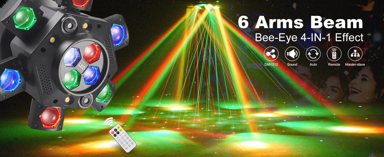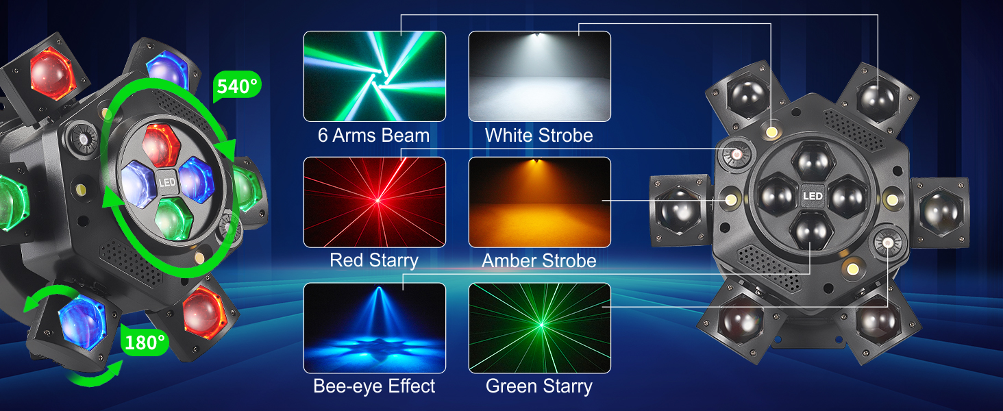 【شعاع 6 أذرع مستدير مع عين النحل الملونة】شعاع 6 أذرع يدور 180 درجة مصنوع من 6 قطع مصابيح rgbw بقدرة 10 وات بينما تأتي عين النحل اللانهائية بزاوية 360 درجة مع 4 قطع مصابيح rgbw بقدرة 10 وات. شعاع الألوان المستدير والرائع بالإضافة إلى عين النحل الملونة سيخلق جوًا عاليًا للغاية بسهولة.