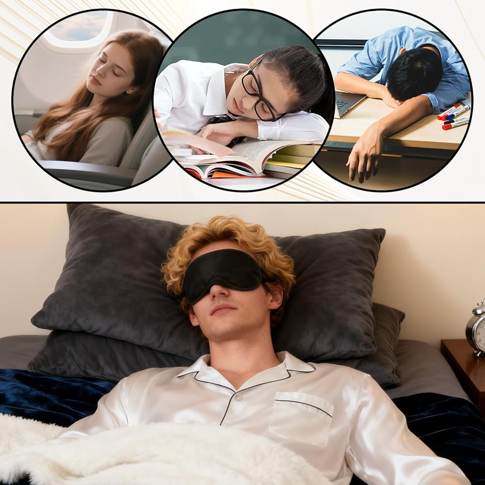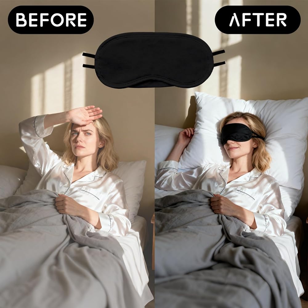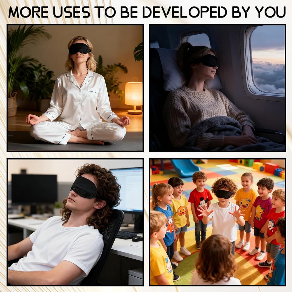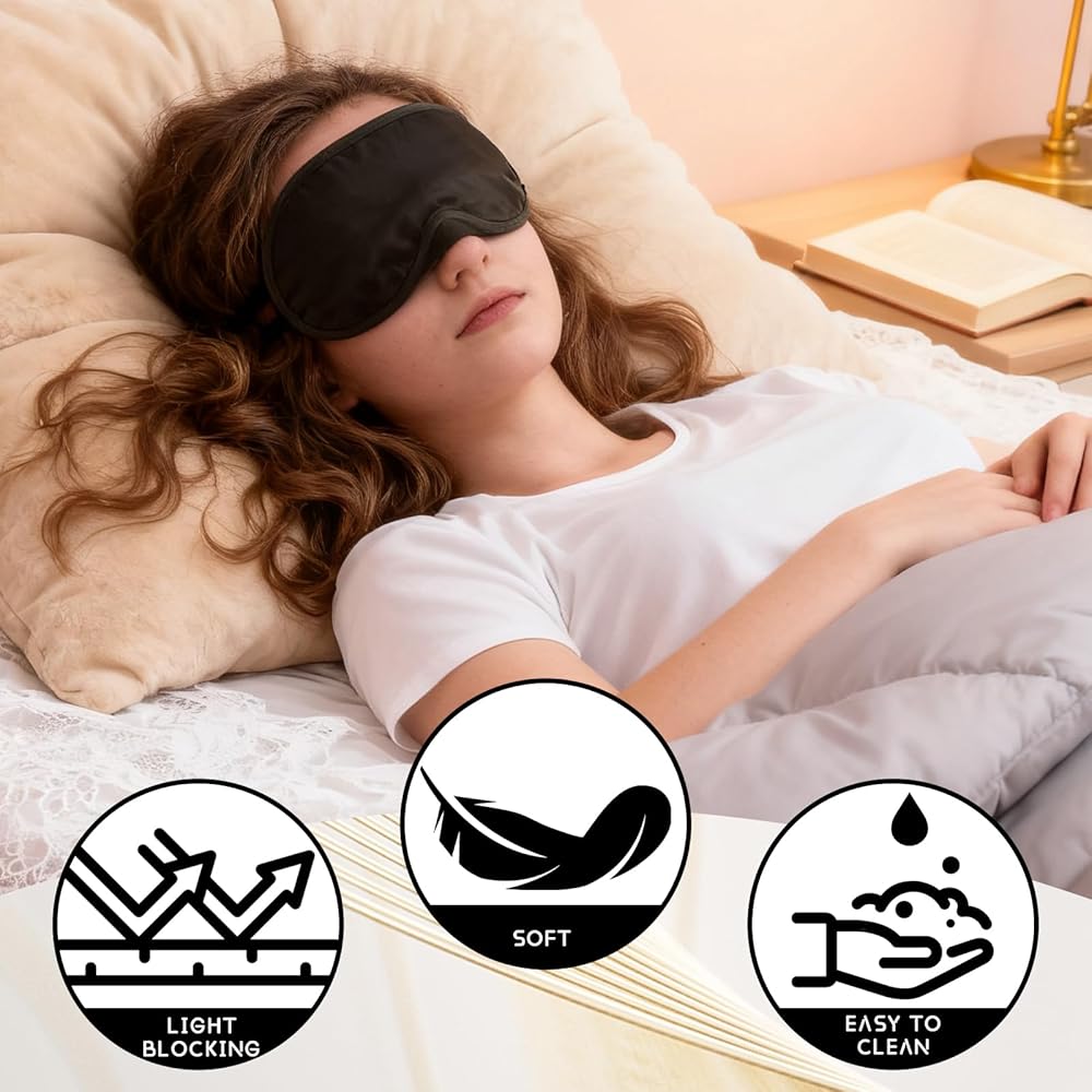 Soft Skin-Friendly Material: The eye mask is made of soft and Smooth polyester-cotton blend feels gentle on eyes — no irritation from rubbing; breathable fabric eye covers for sleeping prevents overheating (ideal for summer travel or warm party rooms). The eye mask completely block out light, they are comfortable to wear.