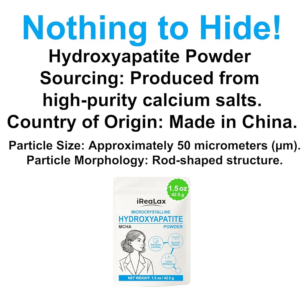 iReaLax 100% Pure Microcrystalline Hydroxyapatite (MCHA) Powder, 1.5oz (42.5g). Non Nano MCHA Micro Hydroxyapatite Powder. Sourced from high-purity natural calcium salts. Particle Size: Approximately 50 micrometers (µm). Particle Morphology: Rod-shaped structure.