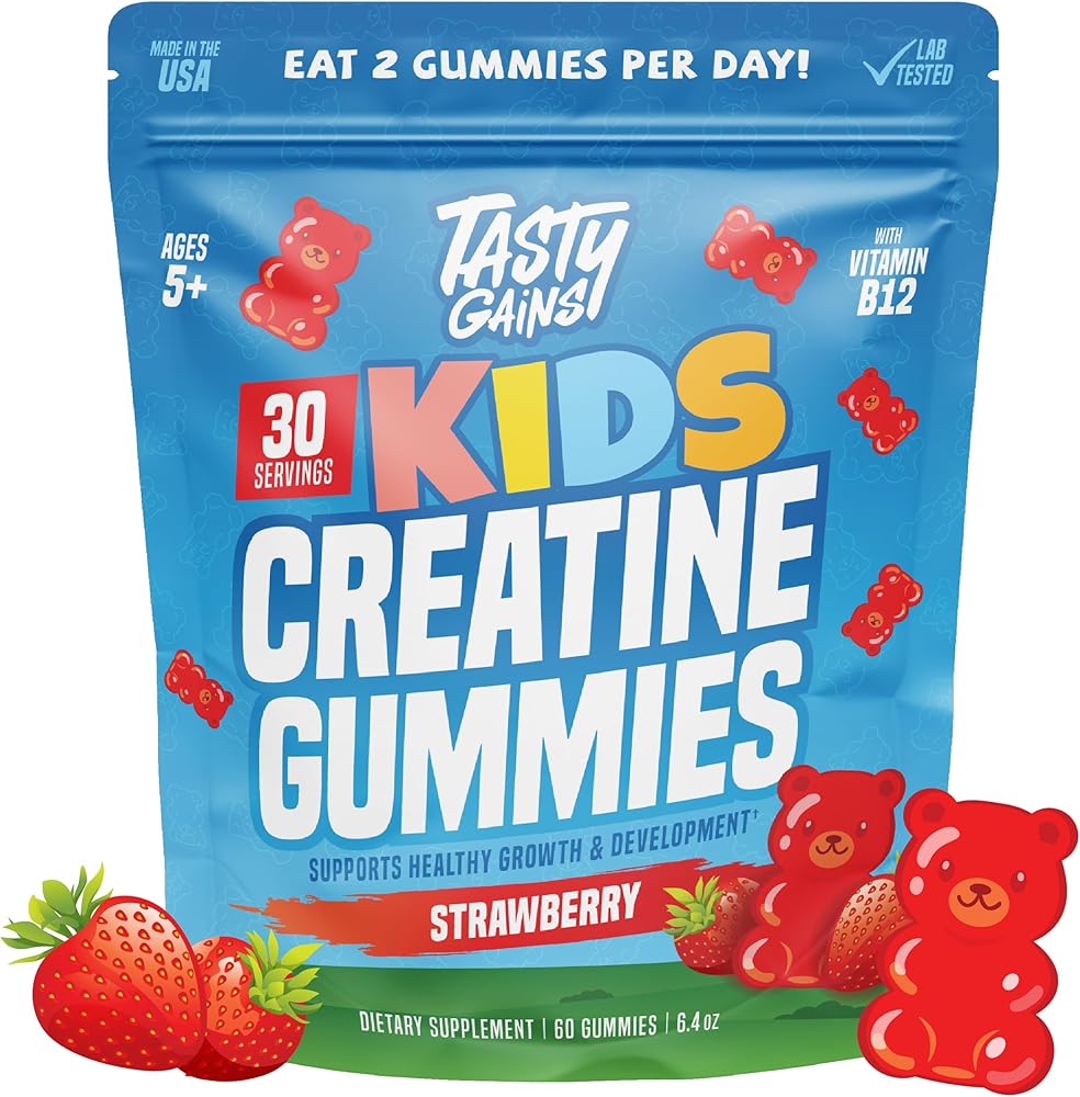 حلوى الكرياتين للأطفال والمراهقين من TASTY GAINS مع فيتامين ب12 لدعم النمو، مكمل يومي سهل المضغ، فيتامينات صمغية للأطفال والمراهقين، للأعمار من 5 سنوات فما فوق