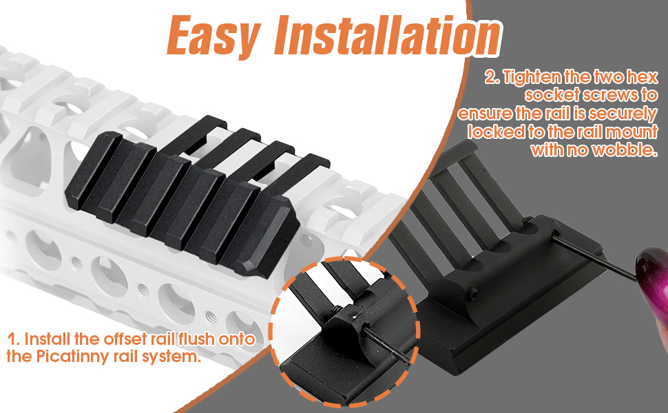 تركيب سريع بدون أدوات واستخدام يمكن استخدامه بكلتا اليدين: تمتع بتجربة الإعداد السهل مع حوامل قضبان picatinny المبتكرة هذه. يتم تركيب حامل السكك الحديدية ذات الإزاحة 45 درجة في ثوانٍ بدون أدوات ووظائف متساوية بالإضافة إلى حامل النقطة الحمراء ذات الإزاحة اليسرى أو اليمنى. يضمن نظام التثبيت متعدد الاستخدامات هذا تثبيت مصباح Picatinny الخاص بك والملحقات الأخرى في مكانها بشكل آمن أثناء التشغيل.