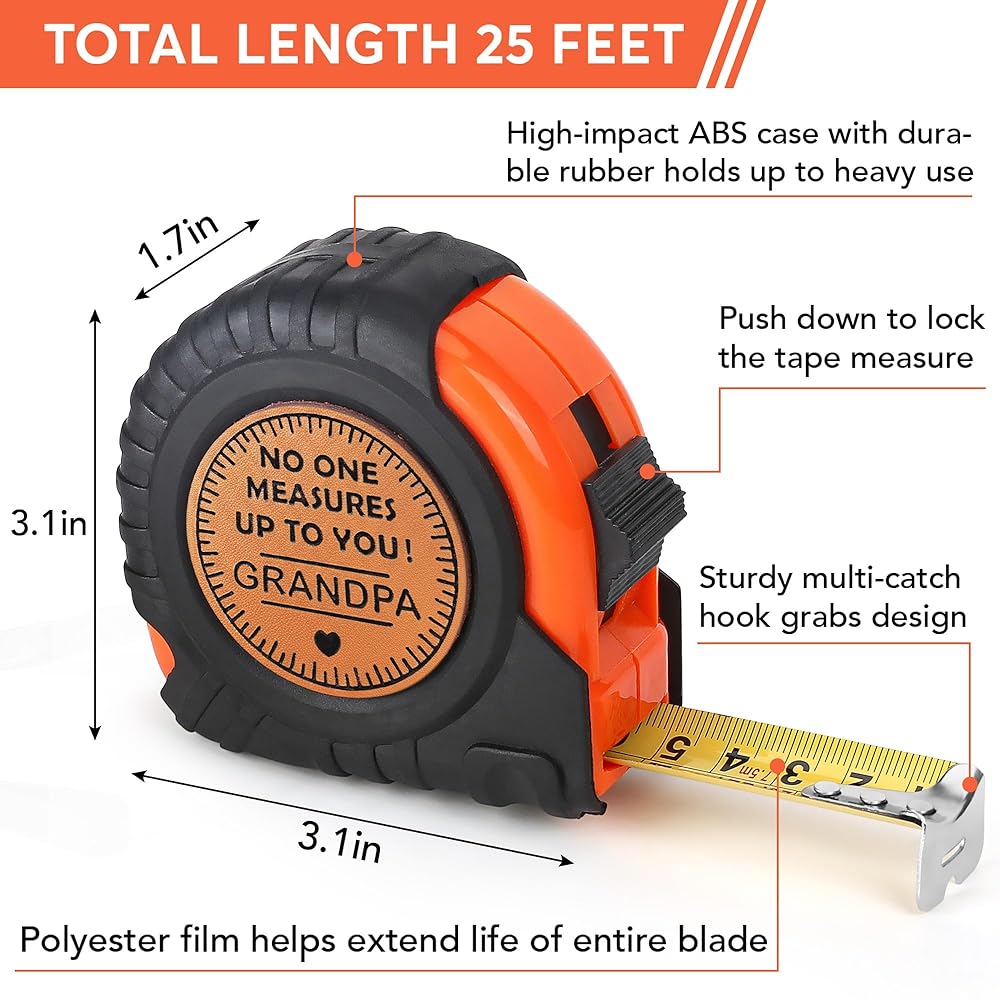 This tape measure gift was created as a meaningful grandpa gift that blends everyday usefulness with heartfelt appreciation. In American culture, tools represent reliability, skill, and standards that guide a family, and this measuring tape reflects those values in a simple yet powerful way. The message “No One Measures Up To You” transforms a classic tool into a lasting reminder of respect, gratitude, and admiration for a grandfather who has always set the bar. Designed as a unique gift for grandpa and grandfather, this tape measure gift fits naturally into moments when words feel insufficient. It works as a birthday gift for grandpa, a Christmas gift for grandfather, or a Father's Day gift that feels thoughtful without being overly sentimental. The measuring theme symbolizes guidance, experience, and influence, making it especially meaningful for honoring life lessons passed down through generations. As a tool gift for grandpa, this piece resonates with those who appreciate practicality. It is ideal for a handyman grandfather, a retiree who still enjoys working with tools, or anyone who values function paired with emotional meaning. Unlike decorative items that fade into the background, this measuring tape remains useful while quietly reinforcing appreciation every time it is picked up. This meaningful gift also carries strong emotional value for milestone occasions. It serves beautifully as a retirement gift for grandpa, recognizing years of dedication, responsibility, and support. It is equally fitting for Grandparents Day, offering a respectful and sincere way to acknowledge the role a grandfather plays within the family. During holiday gatherings, it becomes a keepsake gift that reflects gratitude, love, and recognition without excessive words. The balance of light humor and genuine respect makes this a funny grandpa gift with depth. Rather than novelty alone, it delivers a message that feels confident and enduring. Whether chosen for Christmas, Father's Day, Grandparents Day, retirement celebrations, or meaningful family moments, this tape measure stands as a reminder that true influence cannot be measured by numbers alone. Created as an appreciation gift for grandfather, this keepsake gift honors the idea that some people become the standard by which everything else is measured. It is a thoughtful way to express thanks, admiration, and connection, making it a meaningful part of family traditions and cherished memories for years to come.