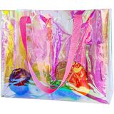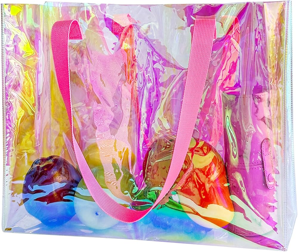Make a stunning statement with this eye-catching holographic clear tote bag. Perfect for stadium events, beach outings, or shopping trips, this spacious tote features durable black handles and a mesmerizing rainbow-effect transparent design that shifts colors as it catches the light. With generous dimensions of 15.75 inches wide, 11.81 inches tall, and 3.94 inches deep, there's plenty of room for all your essentials. The crystal-clear construction lets you locate items quickly while complying with stadium security requirements. Ideal for carrying makeup, personal items, or shopping purchases, this versatile bag combines style with practicality. The sturdy construction and reinforced handles ensure reliable daily use, while the holographic finish adds a touch of modern glamour to any outfit. Keep your belongings organized and visible while turning heads with this fashion-forward transparent tote.